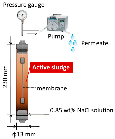 Batch filtration tests were conducted to understand the fouling propensity and flux behavior of the membranes in a laboratory-scale MBR. A schematic diagram of the experimental apparatus is shown in Figure 1. Single membrane modules with a membrane fiber length of 7 cm were prepared using CA, PES, and PVDF hollow fiber membranes. The single membrane modules were installed in a small filtration apparatus with an effective volume of approximately 120 mL. The inside of the filtration apparatus was filled with wastewater supplied by the Shizuoka Prefecture industrial wastewater treatment plant in Japan. The membrane modules were operated under a constant flux of 0.23 m3/m2/day. The MLSS, polysaccharide, and protein concentrations were approximately 4000 mg/L, 14 mg/L, and 150 mg/L, respectively, while the SRT was set and maintained at 15 days. An aqueous solution of 0.85 wt % NaCl was fed into the reactor to prevent concentration of the MLSS. The batch filtration tests were carried out using raw activated sludge without treatment. A detailed procedure has been reported in our previous research [19].