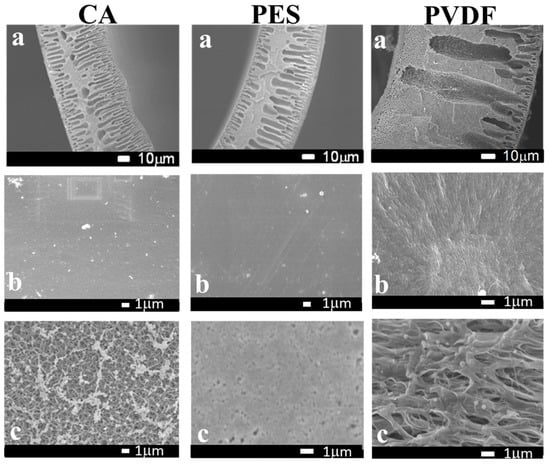 SEM images of cellulose acetate (CA) (30 nm), polyethersulfone (PES) (30 nm), and polyvinylidene fluoride (PVDF) (20 nm) hollow fiber ultrafiltration membranes: (a) cross-sections; (b) outer surfaces; (c) inner surfaces.