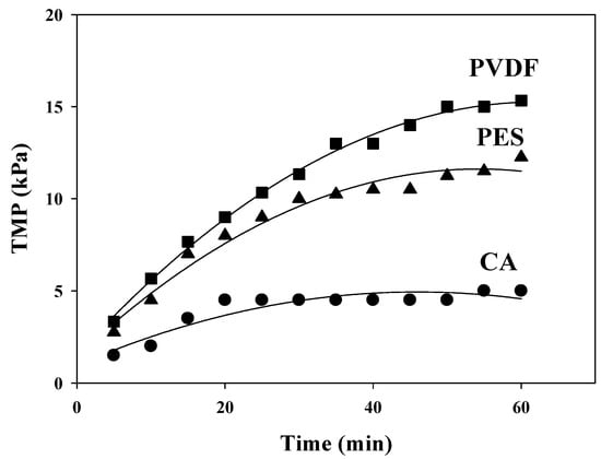 Transmembrane pressure (TMP) changes during batch filtration tests with activated sludge. The pore sizes of CA, PES and PVDF membranes were 30, 30, and 20 nm, respectively.
