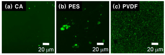 To understand the attachment properties of the microbial flocs on the prepared films, batch attachment tests with activated sludge were performed. Figure 5 shows the CLSM images of the surface of each polymer film after the attachment test. The amount of fluorescent microbial flocs on the surface of the CA membrane was significantly less than seen for the PES and PVDF membranes. It is hypothesized that the hydrophilicity of the CA membrane play an active role in reducing microbial floc adsorption, which is expected to be beneficial for the antifouling properties of the membrane, as shown in Figure 4.