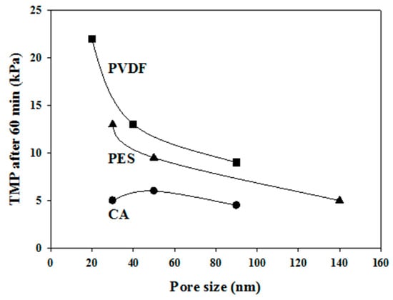 To investigate the effects of membrane pore size on fouling behavior, MBR experiments were conducted using membranes with different pore sizes. Figure 6 shows the relationship between membrane pore size and fouling rate as determined in the batch filtration tests. In this figure, the fouling rates are denoted by the TMP after 60 min of filtration. For the CA hollow fiber membrane, the effect of pore size was unclear. This is because the fouling of the hydrophilic membrane was reduced, so the effect of the pore size was not significant. However, for PVDF and PES hollow fiber membranes, the fouling propensity decreased sharply with increased pore size. This is in agreement with other research results [18,21,29,30]. Marel et al. [31] reported that PVDF with large pores showed greatly reduced membrane fouling in submerged membrane bioreactors. They carried out fouling filtration tests with flat sheet PVDF membranes with different pore sizes (0.03, 0.1, and 0.3 μm) to investigate the influence of pore size on fouling behavior. The membrane resistance sharply decreased with increasing pore size. Our previous research on PVDF MF membranes showed a similar trend [19]. The development of membrane fouling on PVDF membranes decreased in the order 0.02 > 0.25 > 0.4 μm. However, the results for the CAB hollow fiber membrane showed the opposite tendency [19]. This indicates that fouling behavior can be affected by complicated factors such as surface chemical properties, surface morphology, pore size, hydrophilic/phobic properties, and solution chemistry. These factors should be considered together for a definite understanding of the fouling behavior in MBR processes.