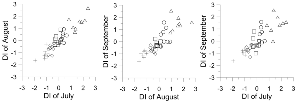Scatter plots of DI respectively between the months July–August, August–September and July–September for the period 1971–2010.