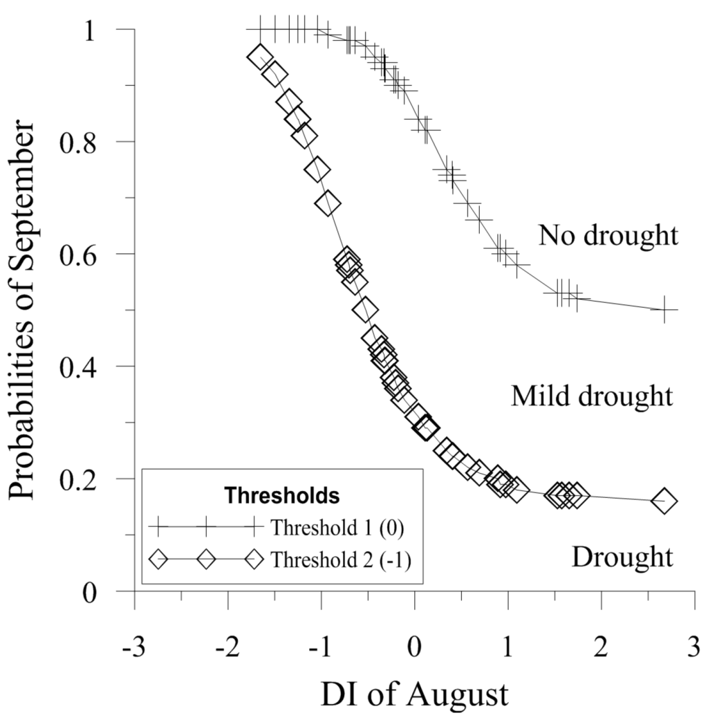Finally, the probabilities of having a category 2 (drought), i.e., DI ≤ −1, can be expressed as: