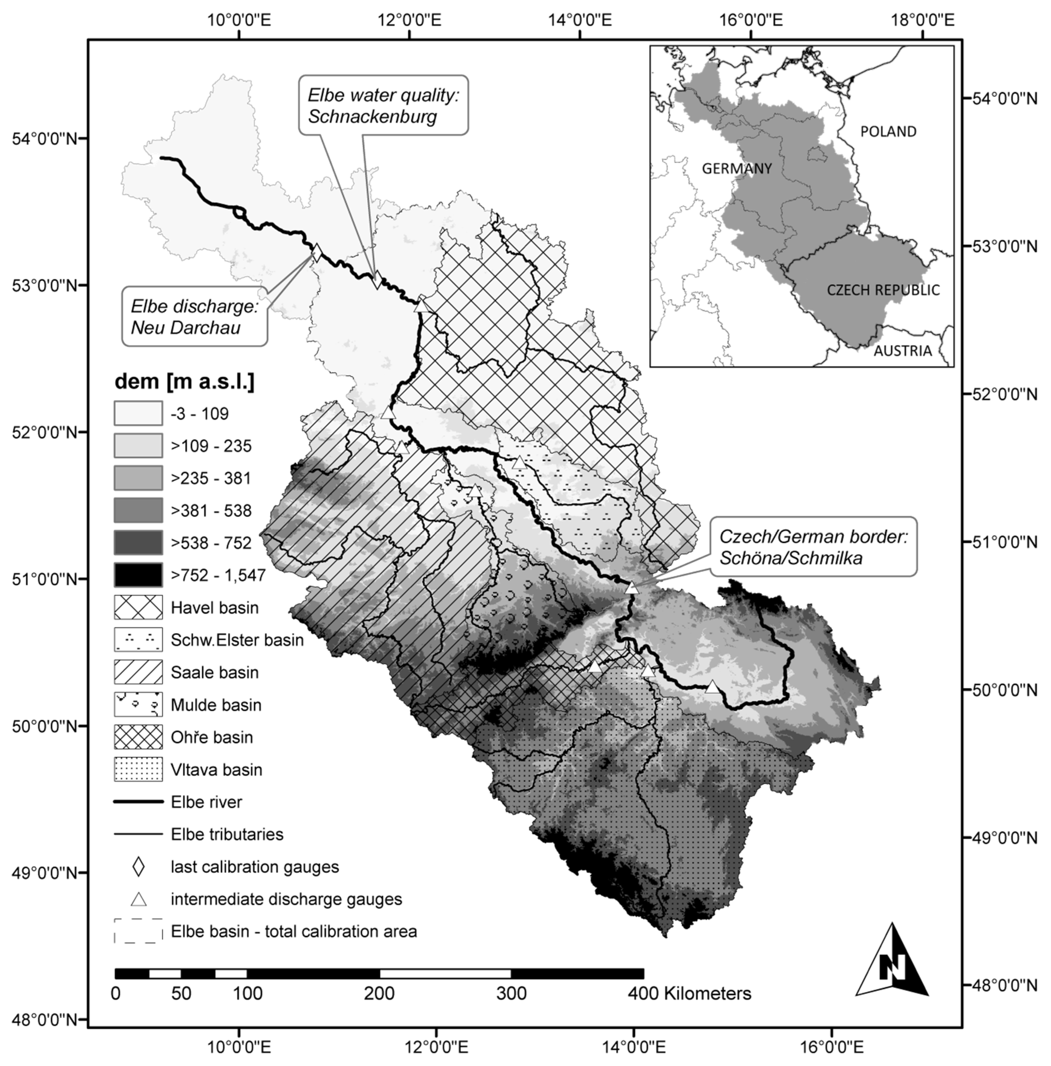 - International Commission for the Protection of the Elbe River (IKSE). Die Elbe und ihr Einzugsgebiet—Ein Geographisch-Hydrologischer und Wasserwirtschaftlicher Überblick; Schlüter GmbH & Co. KG: Schönebeck (Elbe), Germany, 2005; p. 258. [Google Scholar]