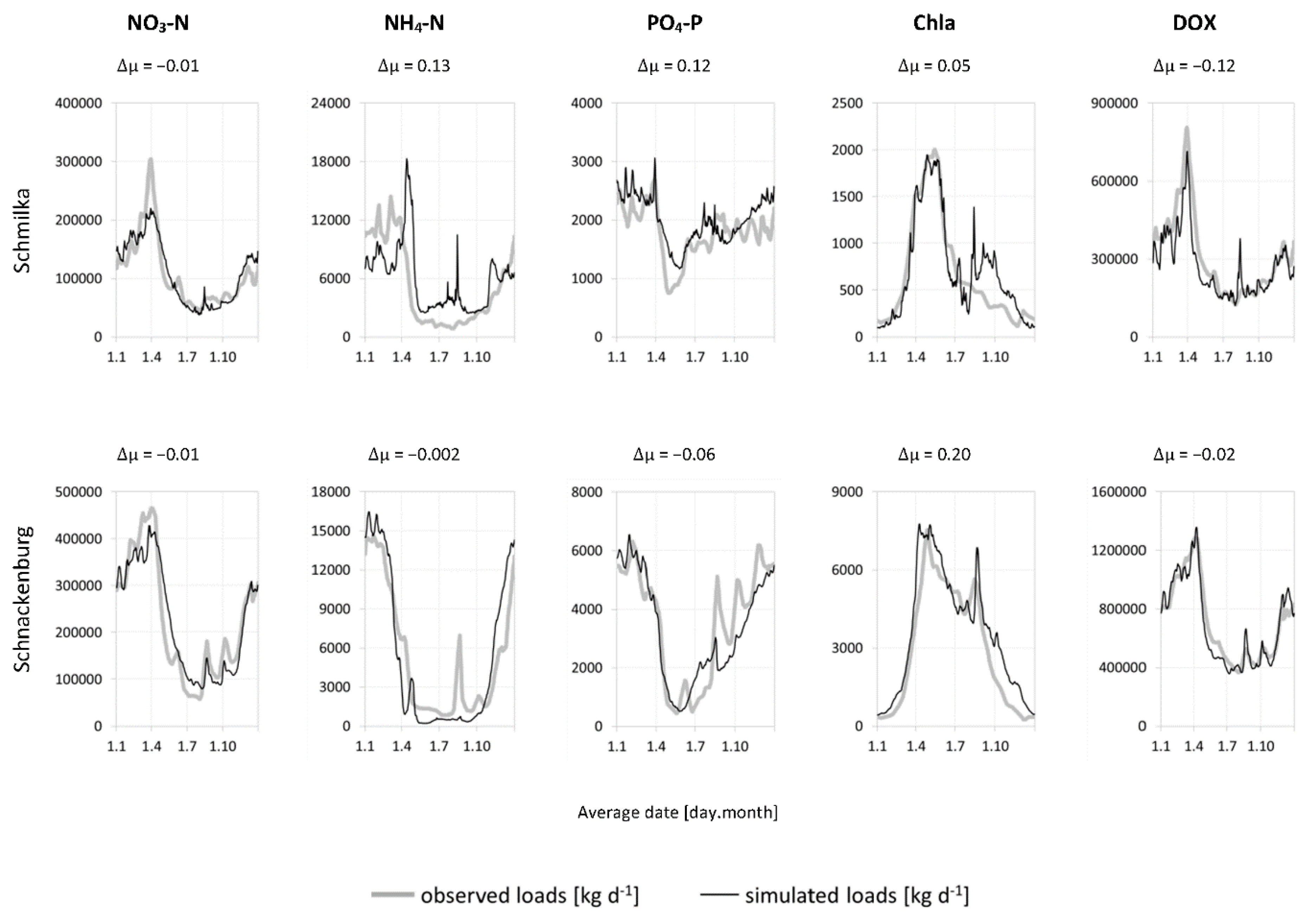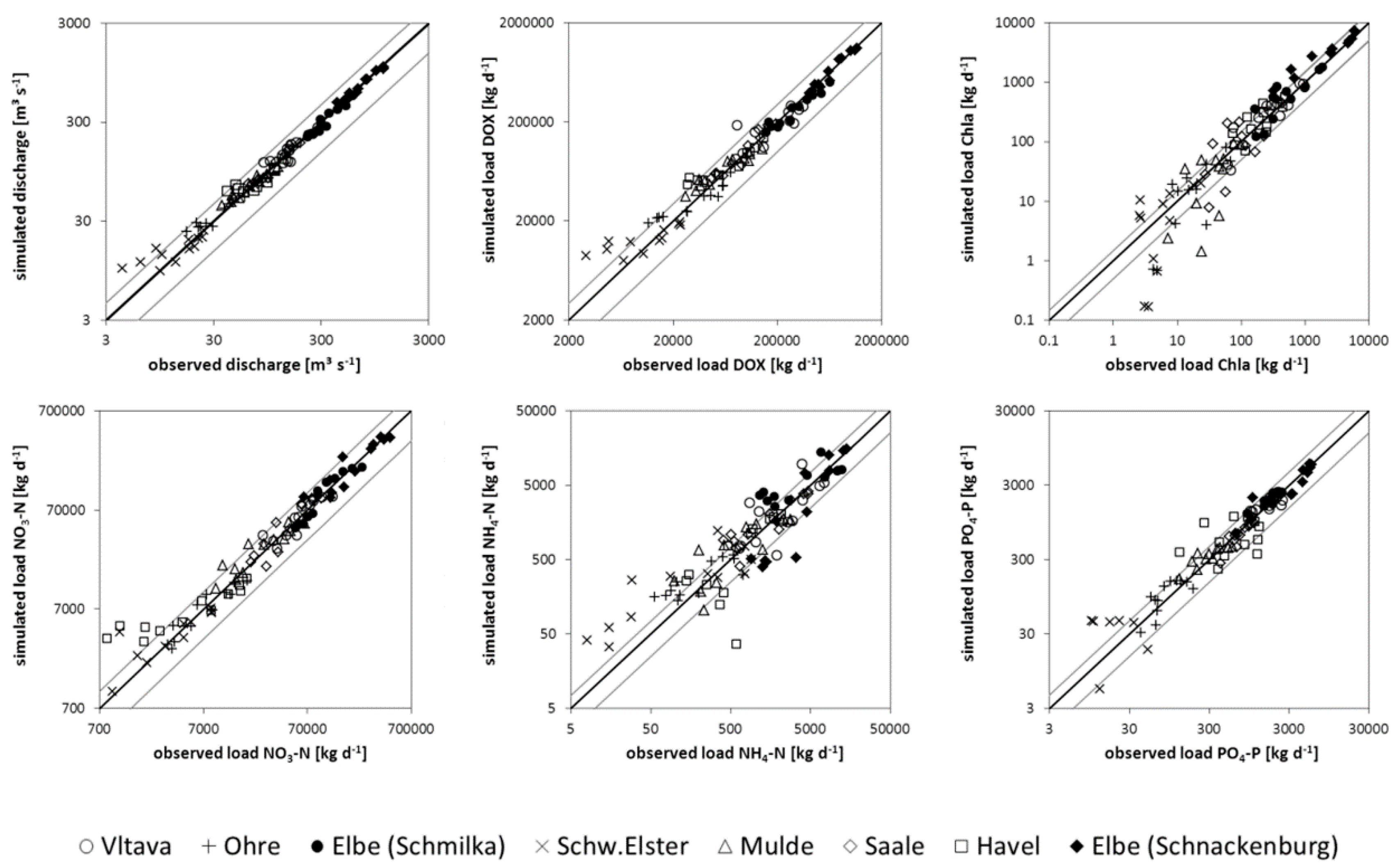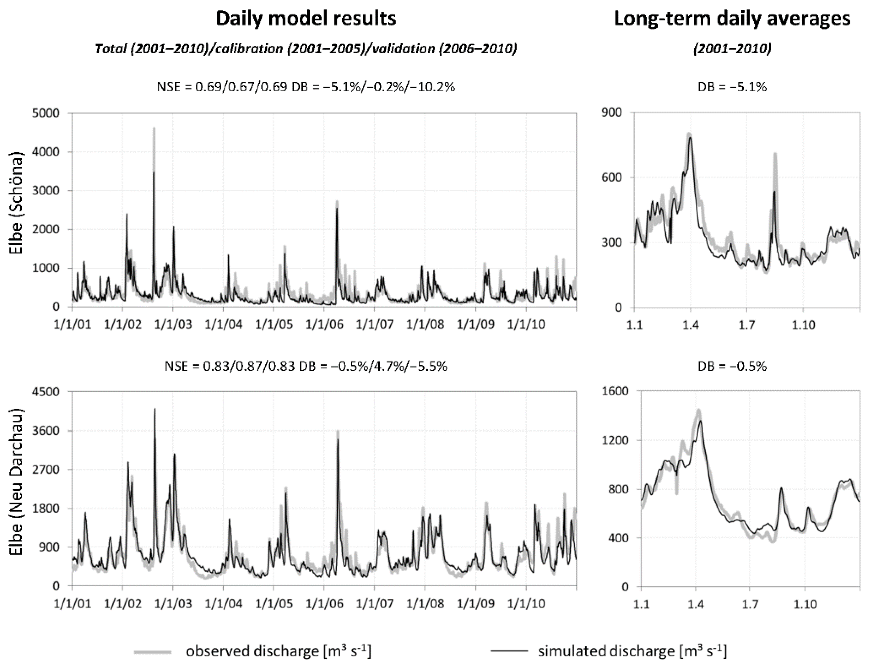 The model calibration and validation for the whole basin was performed for five years, each within the period 2001–2010, considering observed data at the last gauges at Neu Darchau (discharge, Elbe, km 536.4) and Schnackenburg (water quality, Elbe, km 474.5), which are undisturbed by tidal influences. The nutrient loads at the gauge at Schnackenburg were calculated as products of concentration and discharge using the discharge of the gauge at Wittenberge (km 453.9) with the correction factor 1.001 [71].