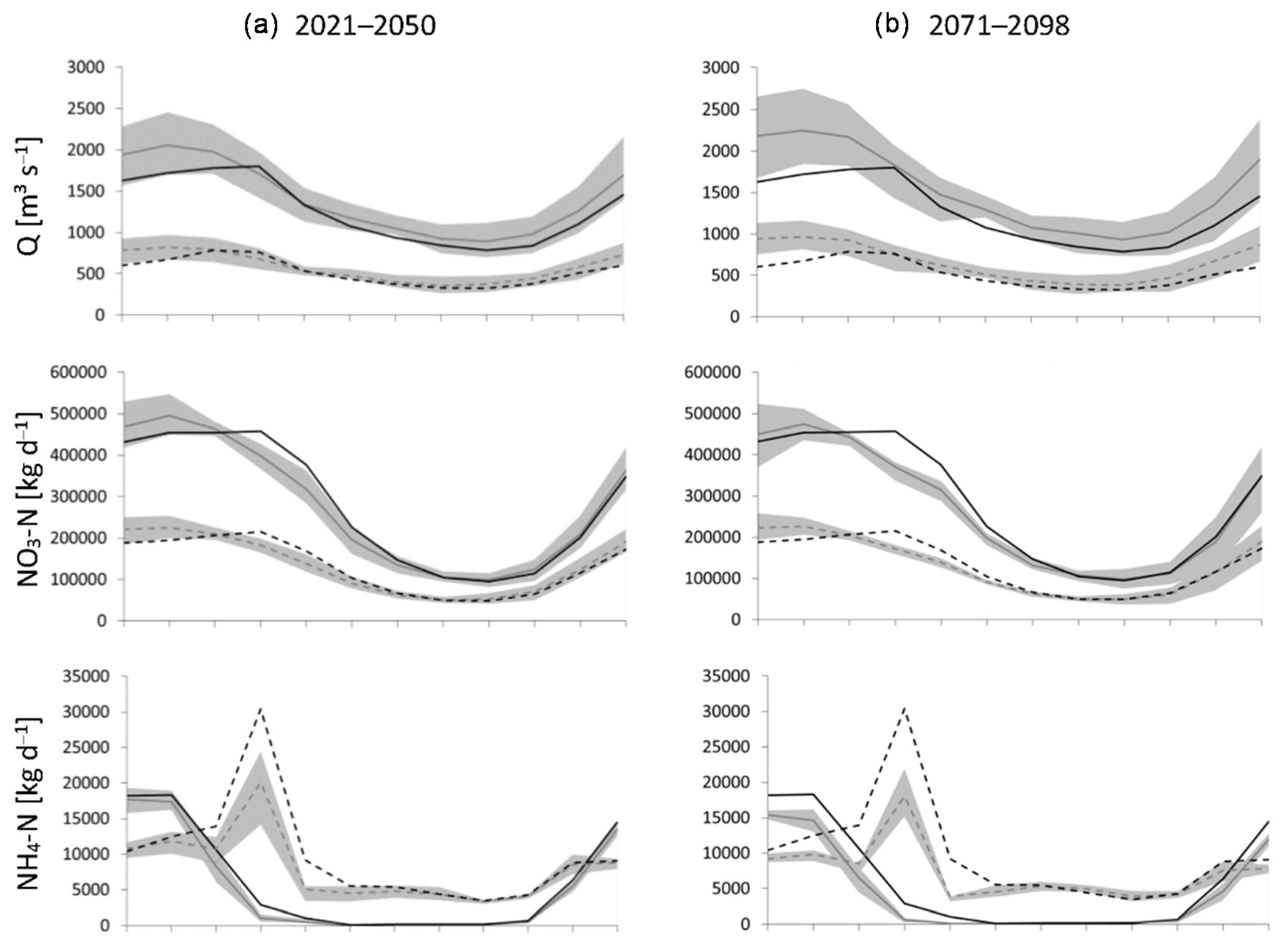 Additionally, climate change would influence nutrient turnover and transport processes (denitrification, nitrification, volatilization and leaching) in the catchments, due to altered temperature and precipitation [32,33,34], and the terrestrial processes will also influence the final river water quality at the outlet of the basin. River systems are also affected by anthropogenic impacts (land use composition, population and industry) causing nutrient pollution from point (factories, sewage treatment plants) and diffuse sources (agricultural fields), which lead to eutrophication processes and a decrease in river water quality [35,36,37,38].