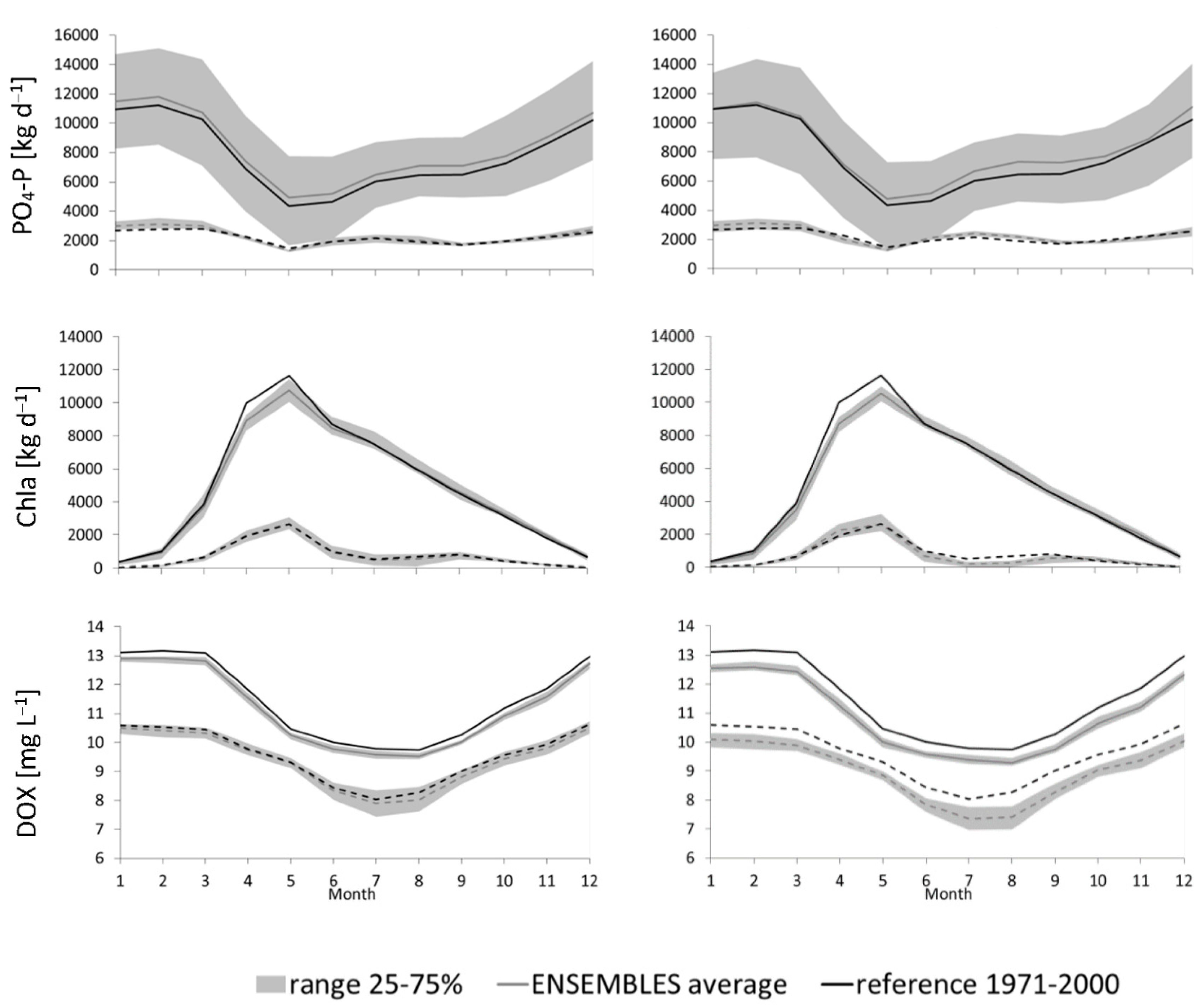 - Analysis of climate scenarios for the region provided by the European ENSEMBLES project [51], and climate change impact assessment on water quantity and quality for two future periods (2021–2050 and 2071–2100) with unchanged management;