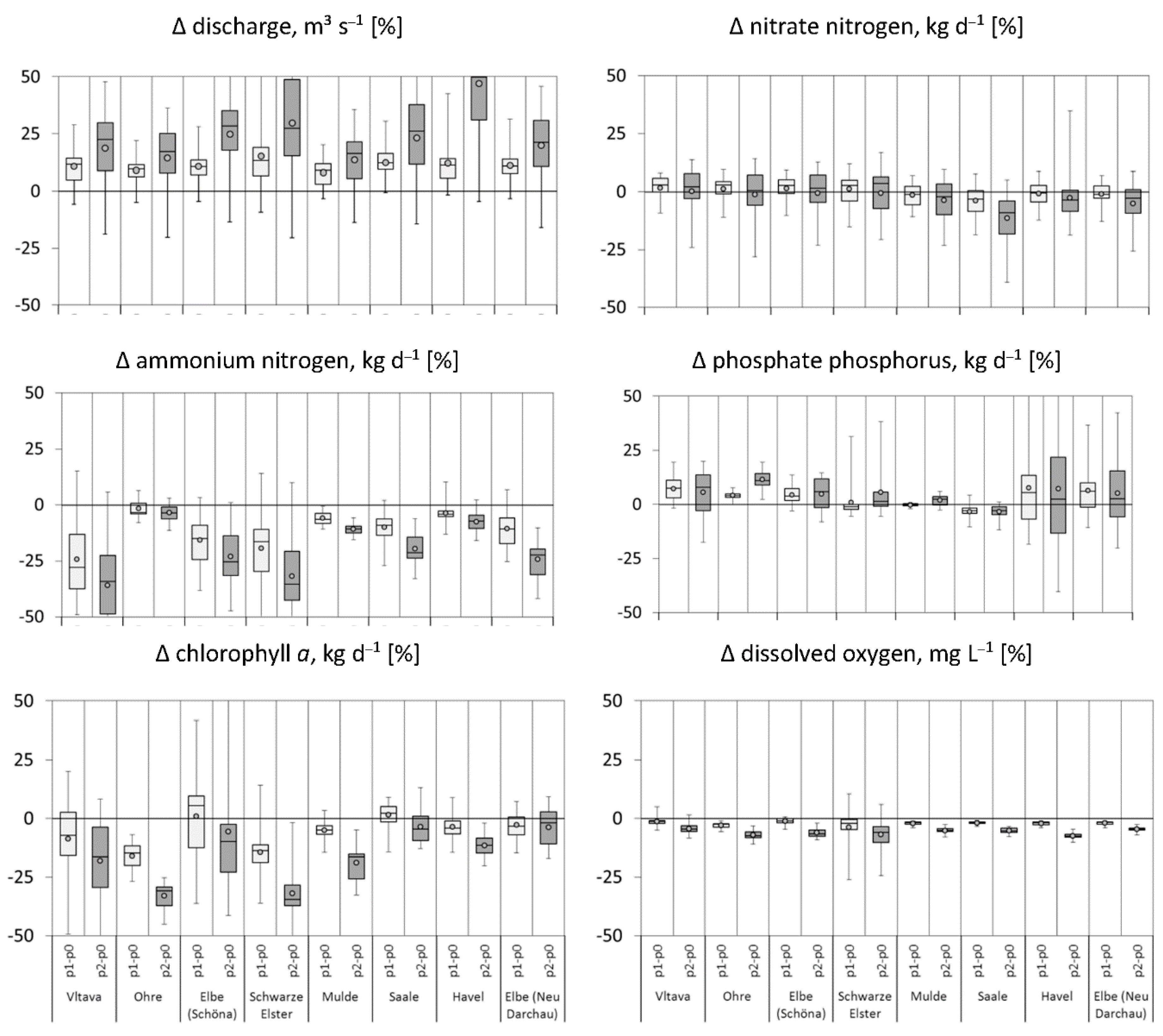 According to the German classification of water quality [54], which uses the 90th percentile for nutrients and the 10th percentile for dissolved oxygen to compare with certain water quality thresholds, the highest nitrate level results in water quality class III (Mulde and Saale), the highest ammonium value belongs also to class III (Vltava), the maximum phosphate phosphorus level represents water quality class II–III (Vltava and Havel), and the lowest dissolved oxygen concentration results in water quality class II (Havel). There is quite high diversity between the rivers in this respect, and no river exists which has the worst or best status for all components.