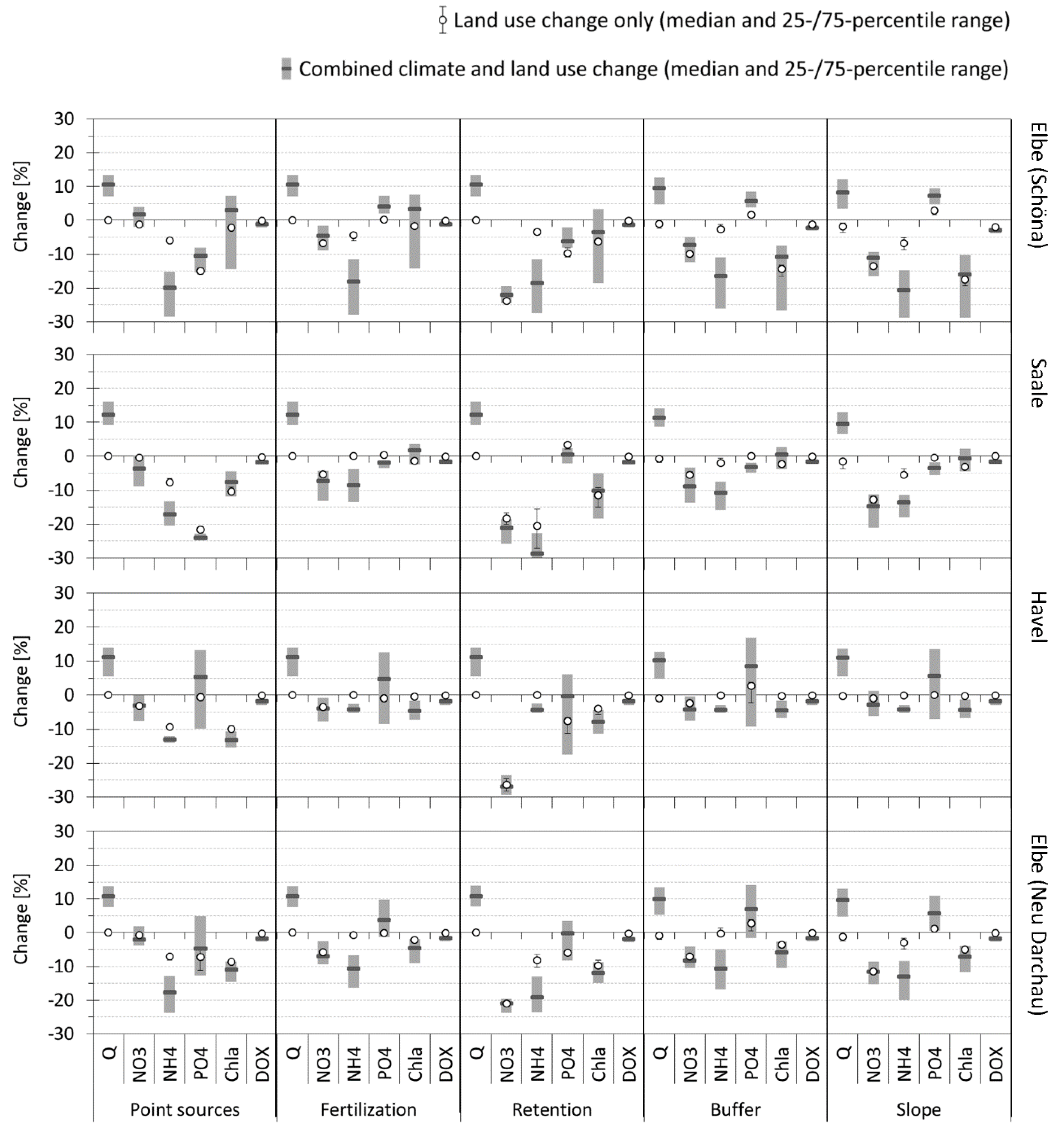 The model-based assessments of climate and land use change impacts on water quality are rare in literature so far compared to impact assessments on the hydrological cycle, especially at the large scale. The recently implemented in-stream module enables a more realistic representation of all interrelated processes for the impact study. Therefore, this study is an important step forward to large-scale application of water quality models with distributed calibration for impact studies in general, as well as towards a fully integrated water resources assessment in the Elbe catchment in particular.