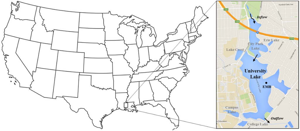 The field observations were made at University Lake in Baton Rouge, South Louisiana, USA (Latitude 30°24’50″ N; Longitude 91°10’00″ W) on the Louisiana State University (LSU) campus (Figure 1). The lake has an open water surface of 74.6 ha with a perimeter of about 6.7 km and an average depth of 0.9 meter. The lake was artificially developed from a swamp area in the 1930s as a public works project to create an open water environment. The most recent dredging was conducted in 1983 when large amounts of sediments and excess nutrients from surface runoff were removed [29]. The drainage area of the entire lake watershed is about 187.4 ha [29,30] and land use of the watershed consists of residential, recreational, and institutional purposes. The lake is heavily affected by anthropogenic sources and a recent study found high concentrations of phosphorus [31] and chlorophyll-a [32].