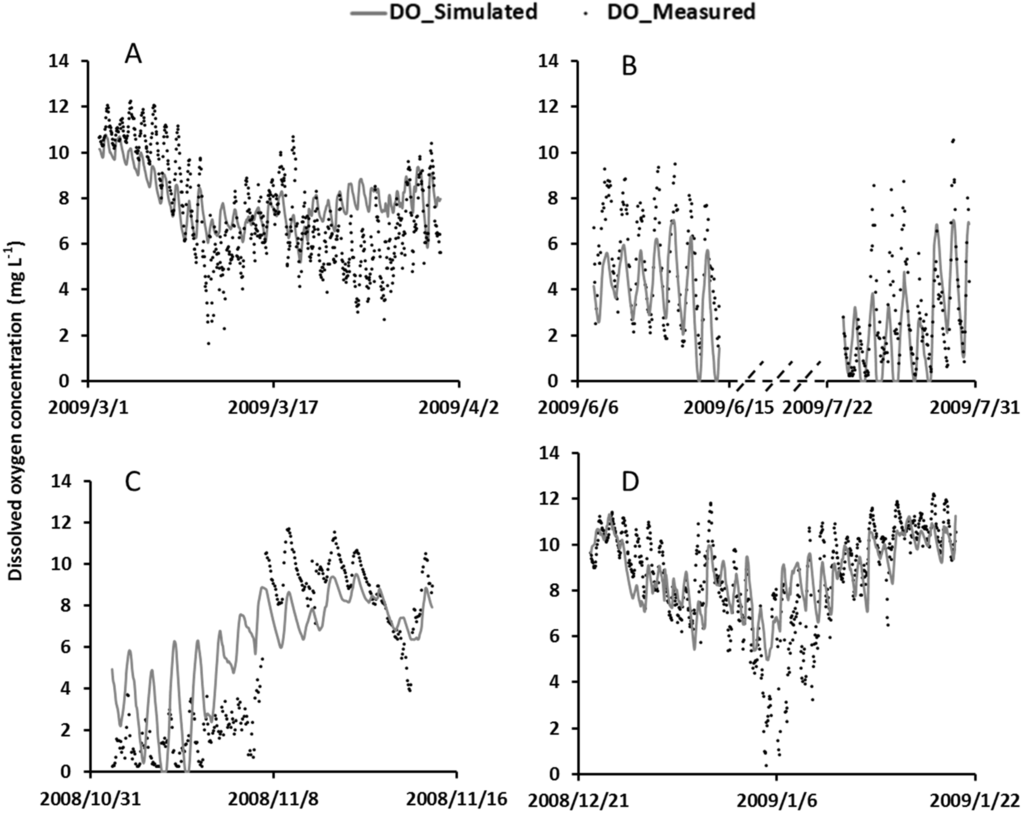 Hourly simulation of dissolved oxygen concentration in model calibration for (A) spring; (B) summer (dashed line on x-axis means discontinuous time); (C) fall; and (D) winter.