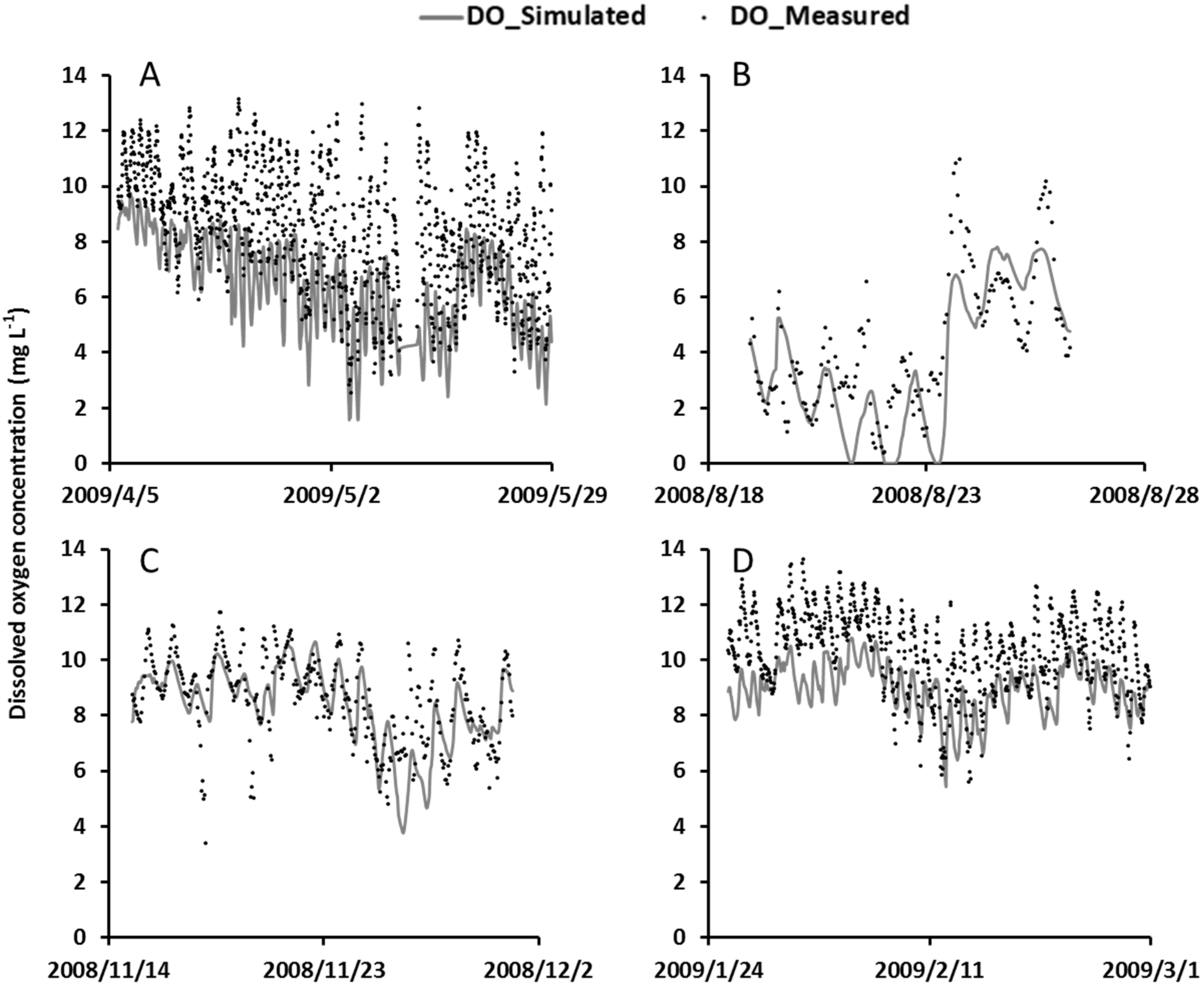The model was calibrated and validated on an annual basis for the time period from August 2008 to July 2009. Means of 15-min records within an hour were used to represent hourly average. If more than two records in an hour were missing, data for that hour would be considered invalid. Only valid hourly data were used for calibration and validation. The studied time period was divided into four seasons, and each season—from spring to winter—was defined as a period of three continuous months with March being the first month of spring. Continuous valid hourly data for all four seasons were divided into two parts—one for calibration and the other for validation—and starting values were the first observed oxygen concentration. During the model run, if simulated DO was less than 0, the predicted DO for that time point was set to 0. The model was run for calibration until optimal fit was met between observations and simulations.
