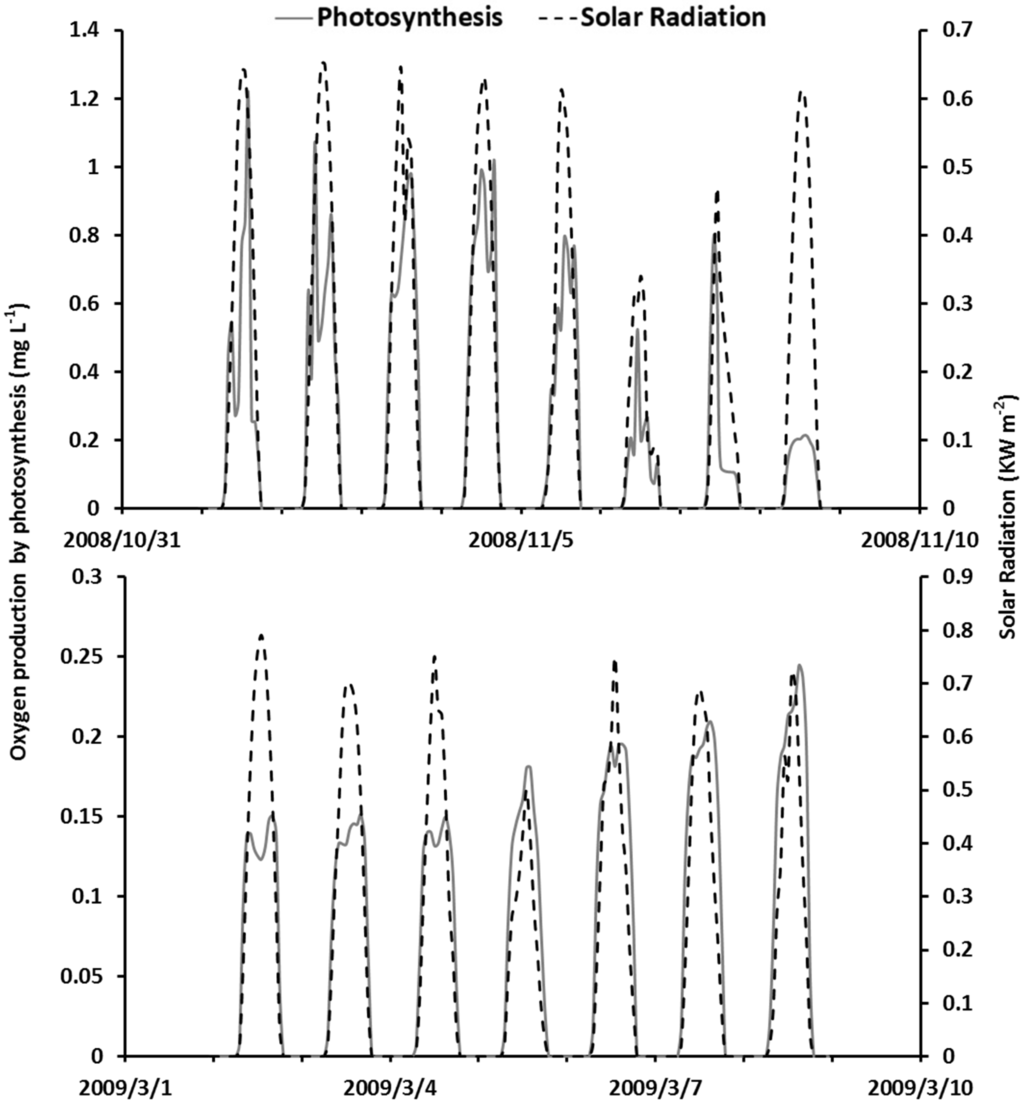 The lack of knowledge for the dynamic interactions among model processes and weather conditions could be a reason for the discrepancies in model simulation. One instance is the relationship between solar radiation and photosynthesis, which is not clearly understood, especially in a high frequency model. The mismatching between photosynthesis and solar radiation during the hours of maximum irradiation could be attributed to photoinhibition. Photoinhibition is negative to the efficiency of photosynthesis, the strength of which is directly proportional to light intensity [58]. The effects of photoinhibition would cause a marked slow-down for photosynthesis at daily peaks of irradiation, but are always ignored in models with lower frequency. In this study, obvious slow-downs in photosynthesis could be found in some model simulations (e.g., early March in 2009, Figure 4) but in not all of them, and the degree of the slow-down in photosynthesis is overestimated sometime (e.g., early November in 2009, Figure 4). This indicates that the addition of photoinhibition as a component of photosynthesis could be beneficial for DO models with high frequency, especially for eutrophic water bodies.