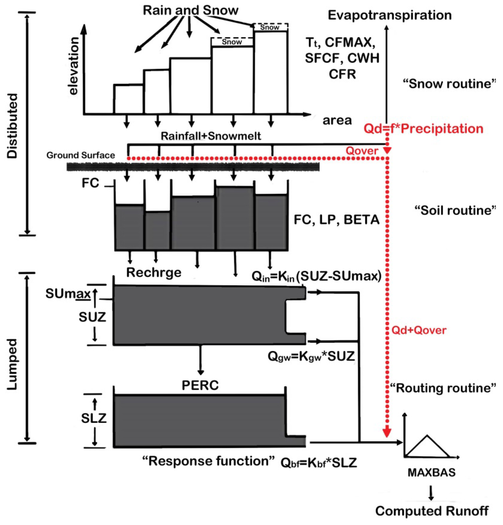 - Lindström, G.; Johansson, B.; Persson, M.; Gardelin, M.; Bergström, S. Development and test of the distributed HBV-96 hydrological model. J. Hydrol. 1997, 201, 272–288. [Google Scholar] [CrossRef]