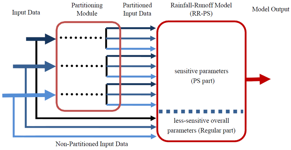 In order to efficiently run the RR-PS model, the first five sensitive parameters are selected for partitioning (i.e., PS part) while the remaining thirteen less-sensitive parameters are excluded from partitioning and are used in the “regular” part of the model as shown in Figure 3.