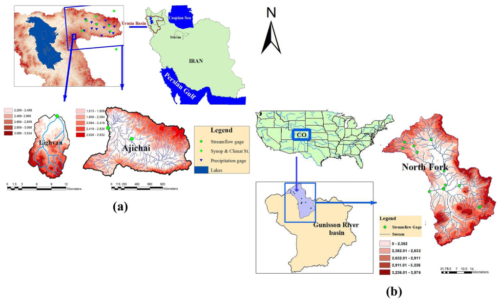 Map of study area: (a) Ajichai and Lighvan basins located in East Azerbaijan province, Iran; and (b) North Fork Gunnison River, in Colorado, USA.