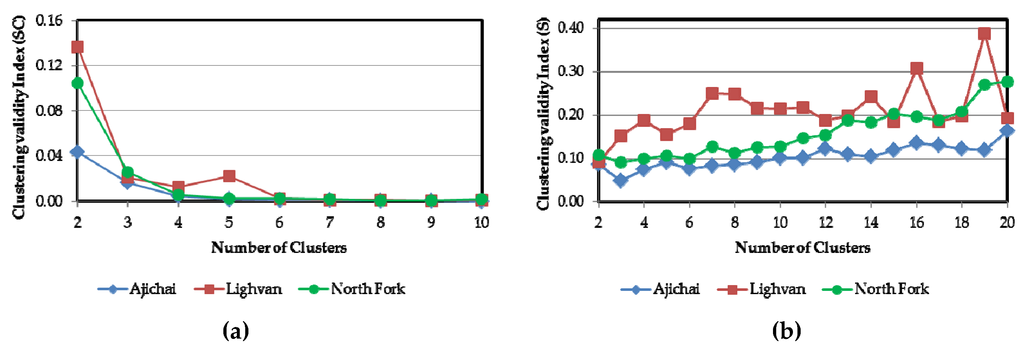 Comparison of clustering validity index by (a) Partition Index (SC) and (b) Separation Index (S).