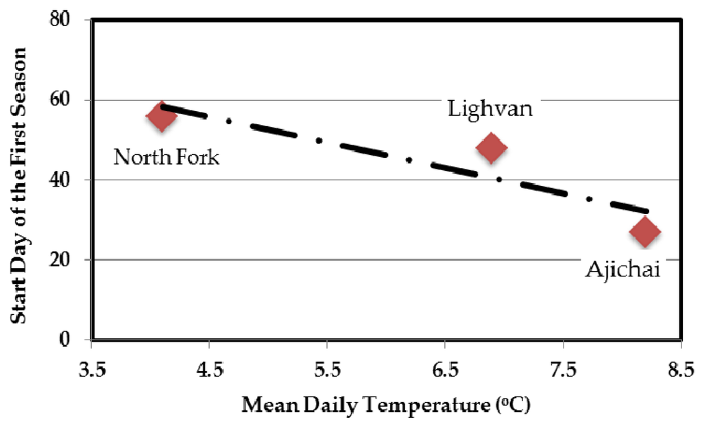 Next, the results show that IHBV-SP equipped by user-defined seasons as compared to calendar based season length, has improved NSE index by 35.0%, 9.0%, and 1.2% in calibration period and by 1.5%, 35.0%, and 4.0% in test period for Ajichai, Lighvan and North Fork basins, respectively. It should be noted that the descriptive parameters of user-defined seasons are determined in the calibration process. For example, assuming the calendar year, the calibration results indicate that the first season starts on Day 27, 48, and 56 in Ajichai, Lighvan, and North Fork basins, respectively. Similarly, the length of first season is found to be 78, 71, and 72 days and that of fourth season is found as 88, 95, and 115 days for Ajichai, Lighvan, and North Fork, respectively. As observable, the starting date of the first season as well as the length of each season varies from one basin to another. This could be due to different climatic conditions in each basin. Figure 7 shows that according to our applications there is in fact an inverse correlation between the length of the starting date and the mean daily temperature of basins. As can be seen in Figure 7, basins with the lower mean temperature have later starting dates for the first season. For example, in North Fork basin, with the lowest mean daily temperature (4.1 °C), the starting date of the first season is latest among all (the 56th day of the year); while in Ajichai basin with a mean daily temperature of 8.2 °C, the first season starts on the 27th day of the year. This shows that cold weather is a determining factor in specifying the start of the first season.