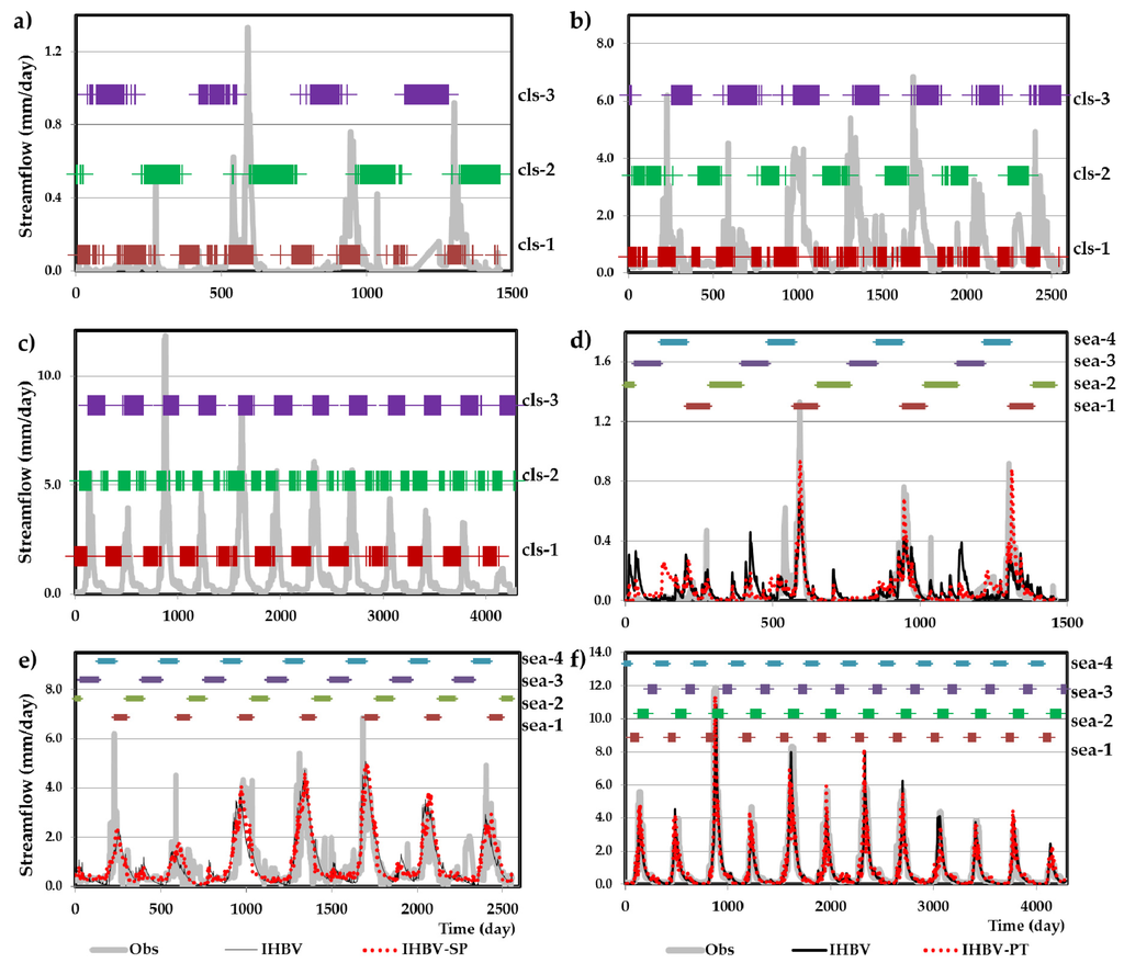 Figure 8 illustrates a comparison between the results of FCM or SP and the observed streamflow at each basin. As observable from Figure 8c, clusters 1 and 3 (cls-1 and cls-3) match low flows and high flows in North Fork very well, while cls-2 mostly matches middle flows and local peaks. However, as it can be seen from Figure 8a,b the clusters in Ajichai and Lighvan are unable to catch the observed streamflow states as well as they did in North Fork. Therefore, two input based clustering methods, i.e. IHBV-PT and IHBV-IS, show weaker performances in these two basins than the seasonally based IHBV-SP method. Meanwhile, IHBV-SP has been able to provide a good seasonal separation in each of the three basins. Figure 8d–f show that in the test period, middle to high flows mostly occur in seasons 4 and 1, while low to middle flows occur in seasons 2, 3 and 4. This clear separation helps IHBV-SP to have a more precise partitioning and consequently a better model performance.