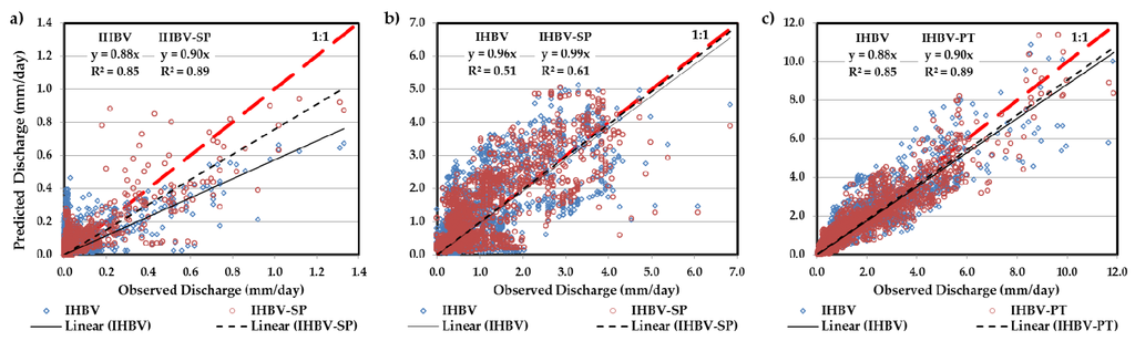 However, the predictions are widely scattered and far from the observed data. In Ajichai (Figure 9a), the model predictions are more tilted downward showing a strong underestimation trend. However, it shows that IHBV-SP has significantly improved the results. Moreover, as can be seen in Figure 9c, in North Fork both IHBV-PT and IHBV models underestimate the peak streamflow with similar performance but less scattered as compared to the other two basins. However, PS models based on FCM analysis (IHBV-PT and IHBV-IS) require partitioning of new input data in each run. While in SP method no addition analysis other than defining the seasons is required. Nevertheless, as mentioned above, the FCM methods are useful when the model input data are suitable for partitioning. On the other hand, for the cases where seasonal variations are important, partitioning based on seasons (i.e., SP) would help to improve the model outputs. In general, partitioning is only useful if there exists a grouping-based behavior within the system.