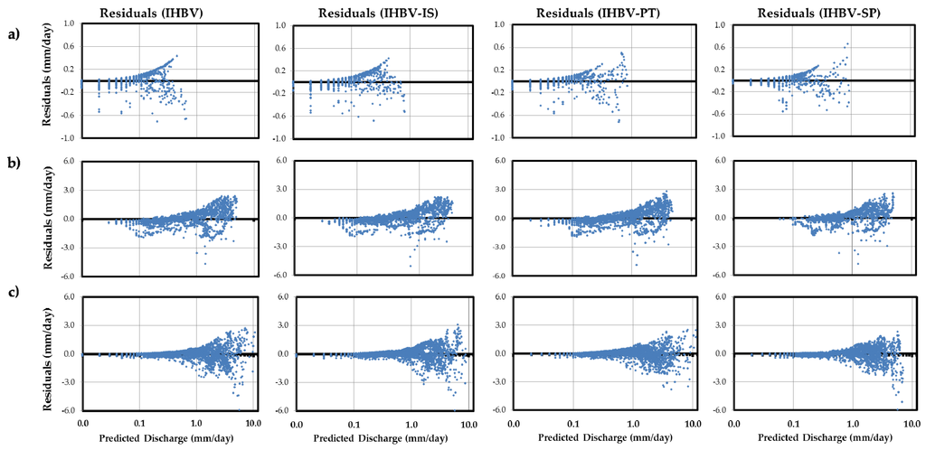 To clarify the behavior of residuals, x-axis is defined logarithmically. By comparing the scattergram of IHBV-IS, IHBV-PT, and IHBV-SP with IHBV, it becomes clear that residuals in all of the models are distributed around zero, although it is not possible to make an explicit judgement about homoscedasticity in the residuals of each RR-PS model. Therefore, it is preferred that homoscedasticity of residuals of each model be tested by the non-parametric Kruskal–Wallis H-test as it follows [64].
