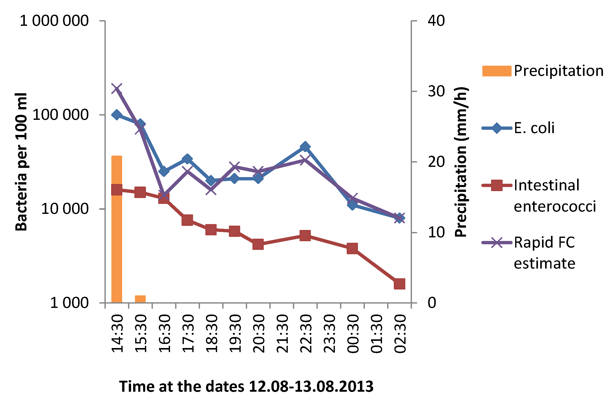 Fecal indicator bacteria in the Hovinbekken River during and after heavy rainfall on 12 August 2013.