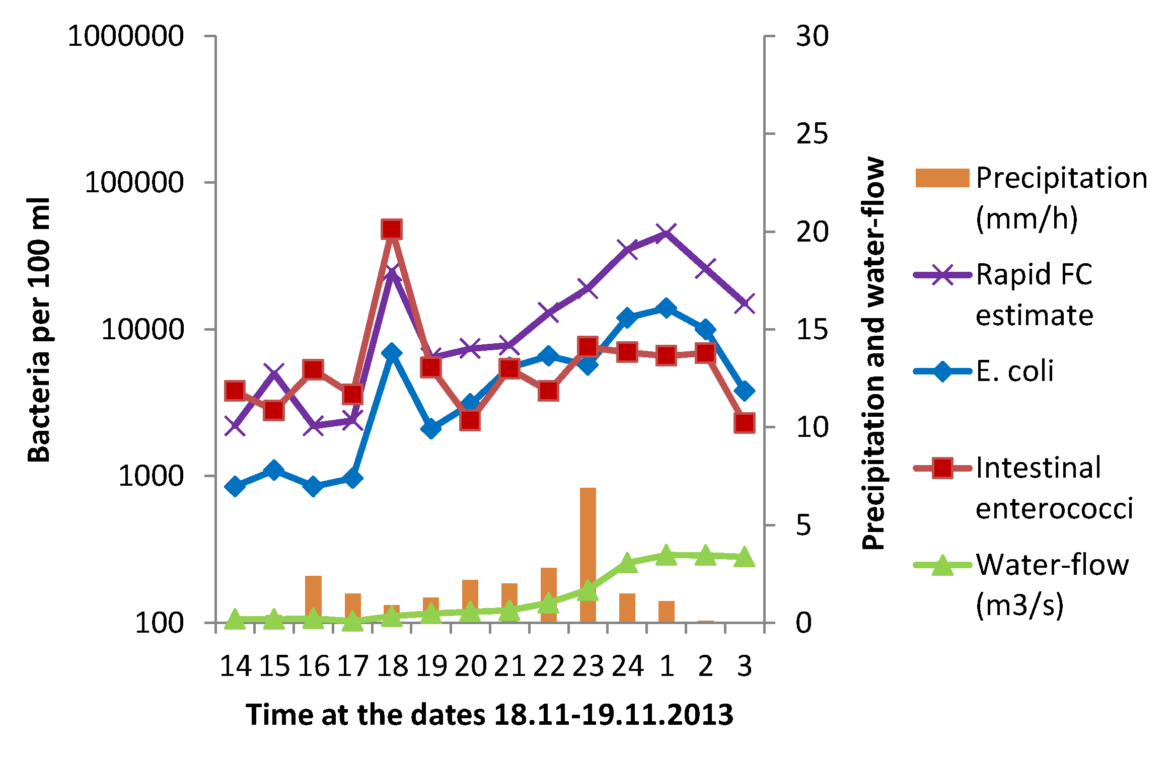 Fecal indicator bacteria and water-flow in the Ljanselva River before, during and after rainfall on 18 November 2013.