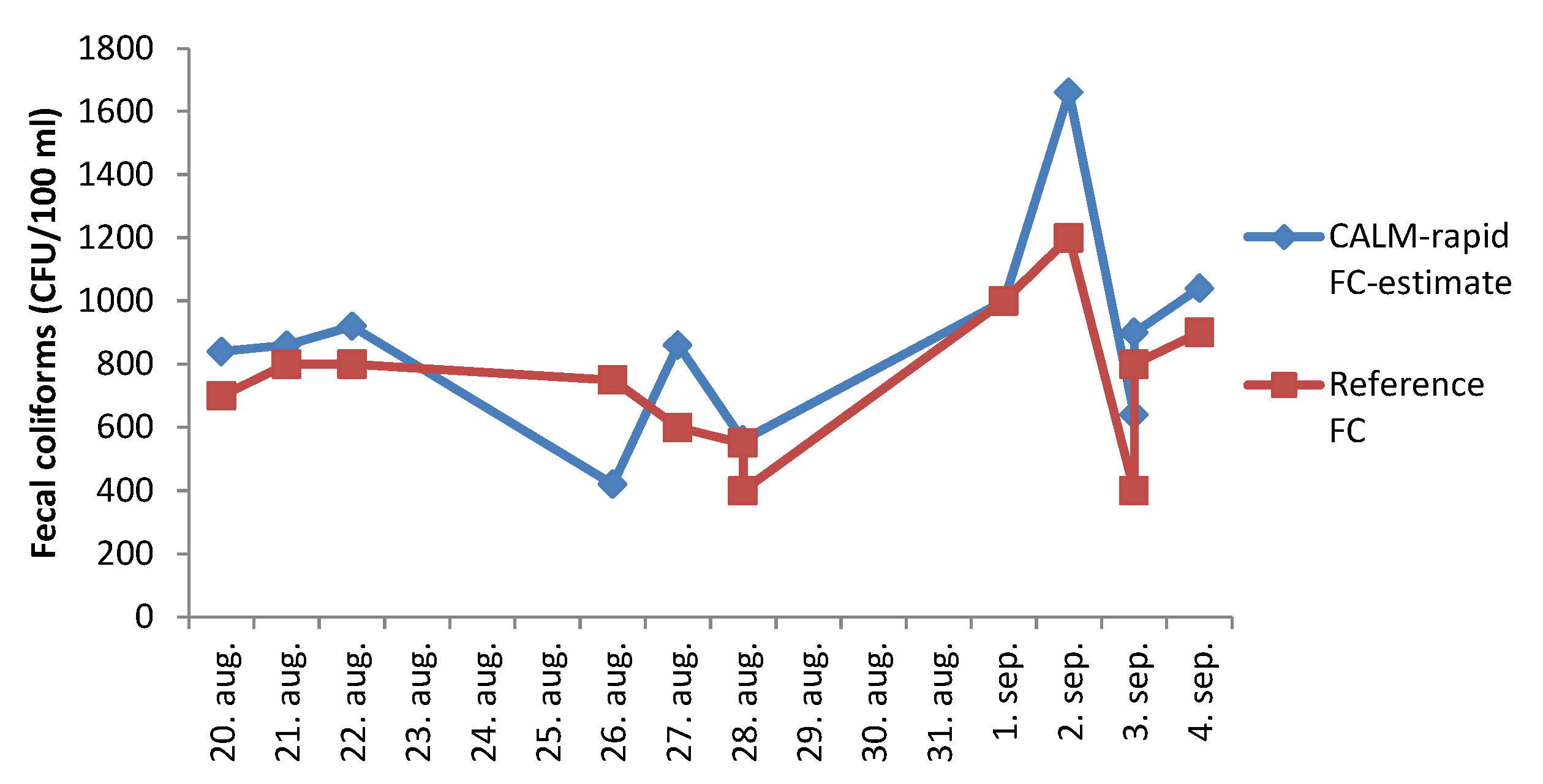 The concentration of fecal coliforms in Akerselva (Myraløkka) at different dates during the late summer period of 2014, measured by the reference method and the fully automated CALM using a method based on 2-h measurement of the GAL activity.