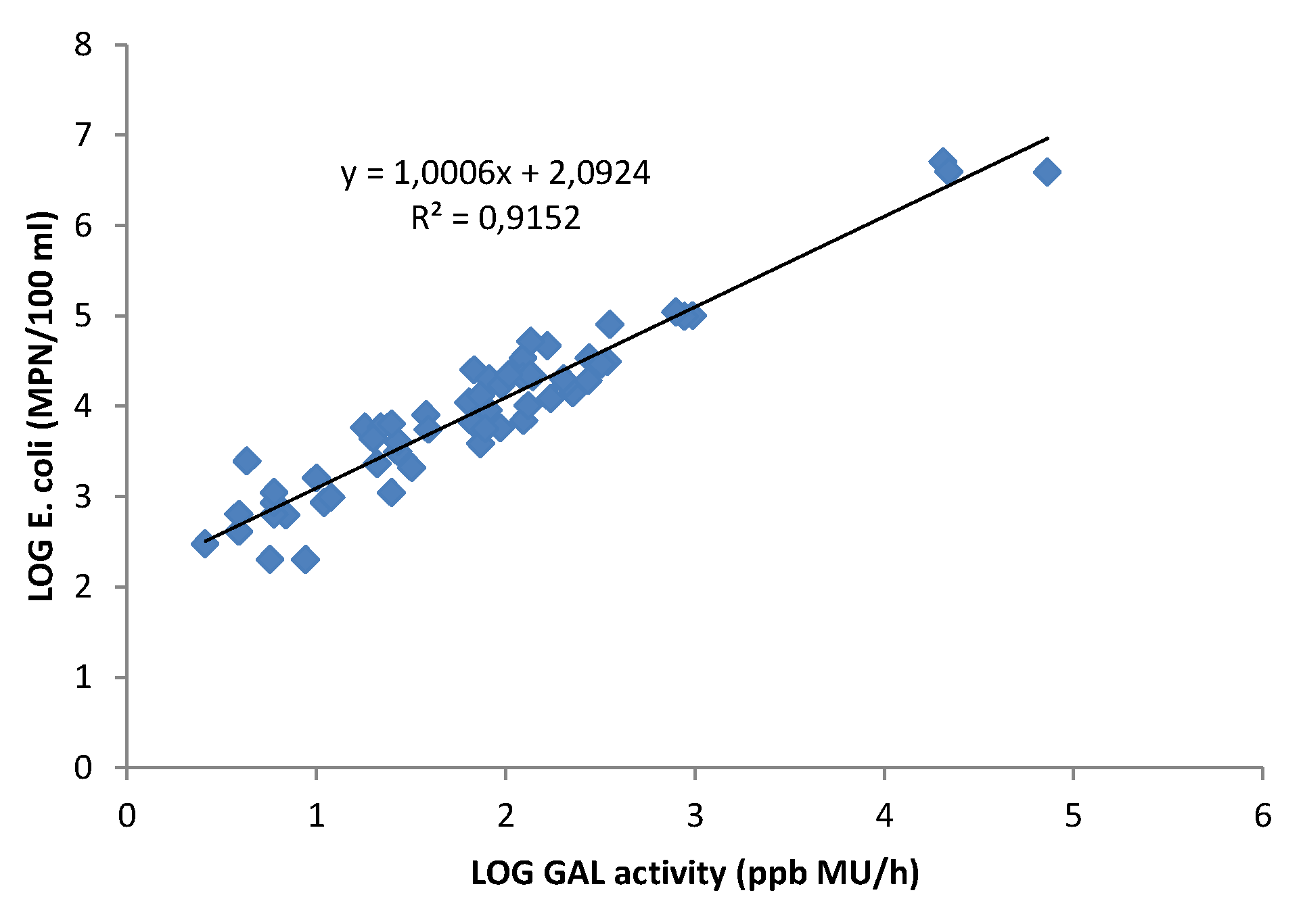 For investigating potential correlation between GAL activity and the numbers of E. coli in the fresh water samples, the numbers were presented in logarithmic scale. The coefficient of determination (R2) of log10-transformed values was calculated (linear regression) using Microsoft Excel.