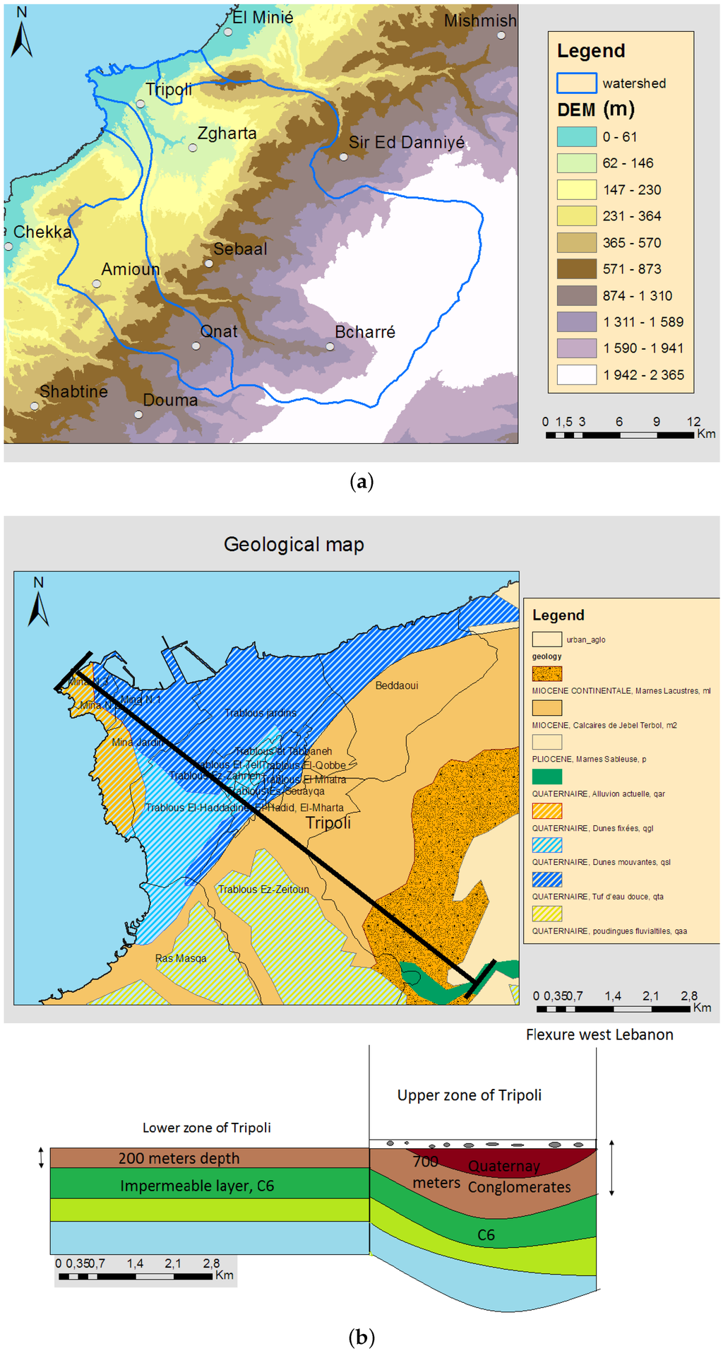 Elevation and geological maps of area of interest; (a) Elevation Map of Tripoli watershed; (b) Geological map and stratigraphy of Tripoli [23].