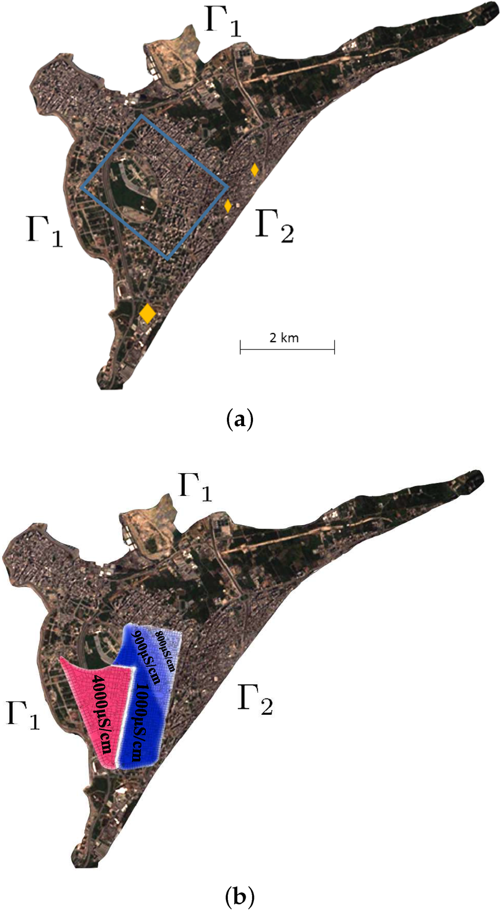 The total private wells pumping rate is about 20,828 m per day. This excessive well pumping has caused an increase in the seawater intrusion [6]. The electric conductivity has been measured in nine wells in “Dam and Farz” neighborhood in 2008 [6]. These measurements show that this region can be divided into four zones based on water ionic content, see Figure 3b. The electrical conductivity was also measured in the same wells in 2009 and showed a notable increase, from 800 μS/cm to 1000 μS/cm [6]. These limits exceed the limits for drinkable water which are below electrical conductivity of 1000 μS/cm [26].
