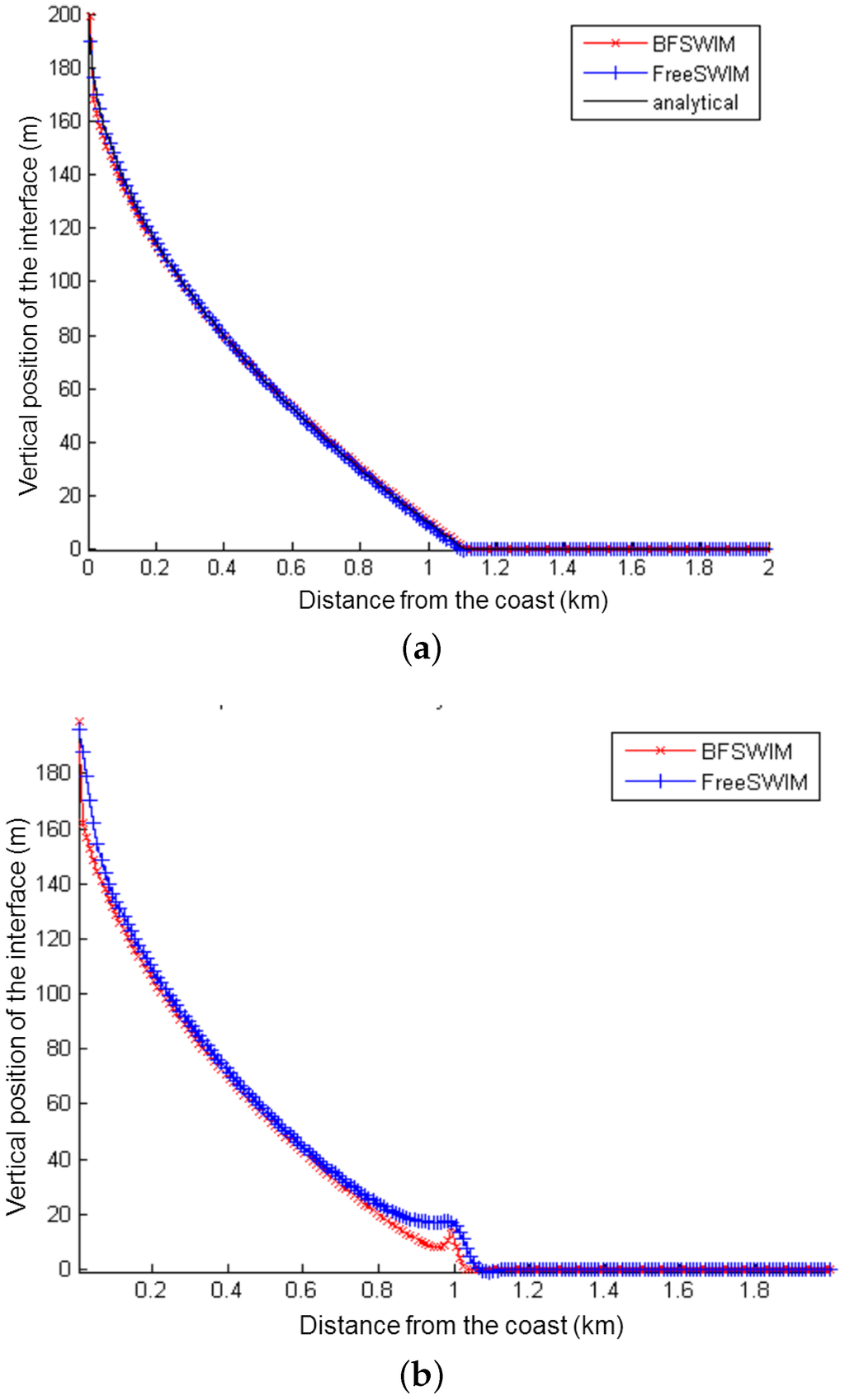 Comparison of solutions (a) without pumping and (b) with pumping. FreeSWIM vs. BFSWIM and analytic solution in (a) and FreeSWIM vs. BFSWIM solution in (b).