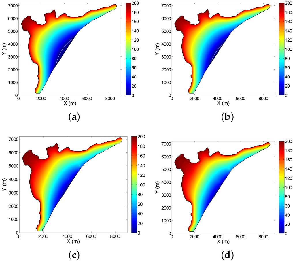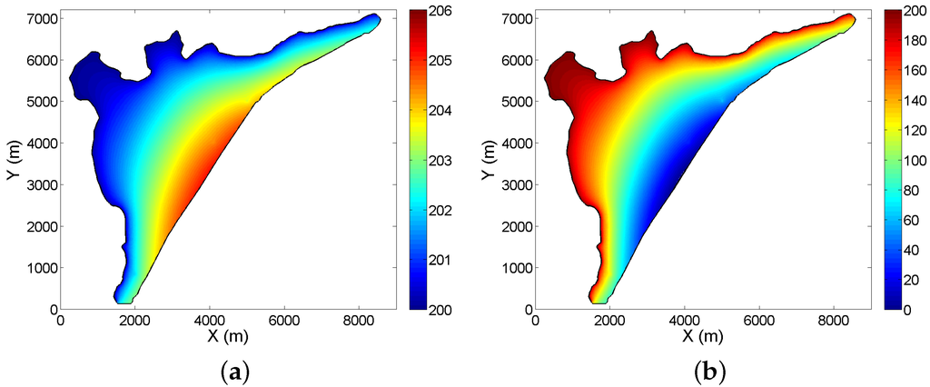 Based on [22,23], the hydraulic conductivity has been estimated by a constant value of 1.388 × 10 m·s. The impermeable layer is at m and the sea level is at m.