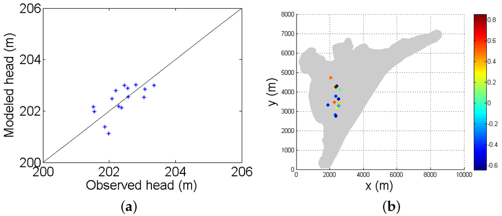 The “CUR” simulation results are compared to the measured hydraulic head in observation wells in the aquifer. The comparison is done using the wells inside the domain and don’t include the wells used for calibration that are at the outskirts of the domain. The validation data set is constituted of 15 wells localized in the main area of interest of “Dam and Farz”. Figure 9a shows the scatter plot of the observed head vs. the modeled head. We notice that there is little variability in the head values. This can be explained by the high depth of the aquifer. The hydraulic head gradient is consistent with the expected value for a coastal aquifer with sandy marl soil [8]. The figures also show that the modeled head fits well with the measured one with a root mean square deviation of = 0.819 m. Figure 9b shows the localization of the observation wells. The color represents the difference between mean observed head and modeled head. The position of the observation wells in the area of interest are well shown. Figure 9 shows that the model gives satisfactory results in terms of hydraulic head and that little place for improvement can be achieved through a calibration using existing hydraulic heads. The difference map does not show a high spatial correlation between bias values. No specific pattern can be depicted.