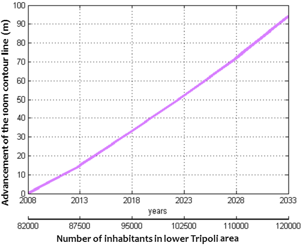 Advancement in-land of the 100 m contour line of the seawater freshwater interface with respect to demographic evolution.