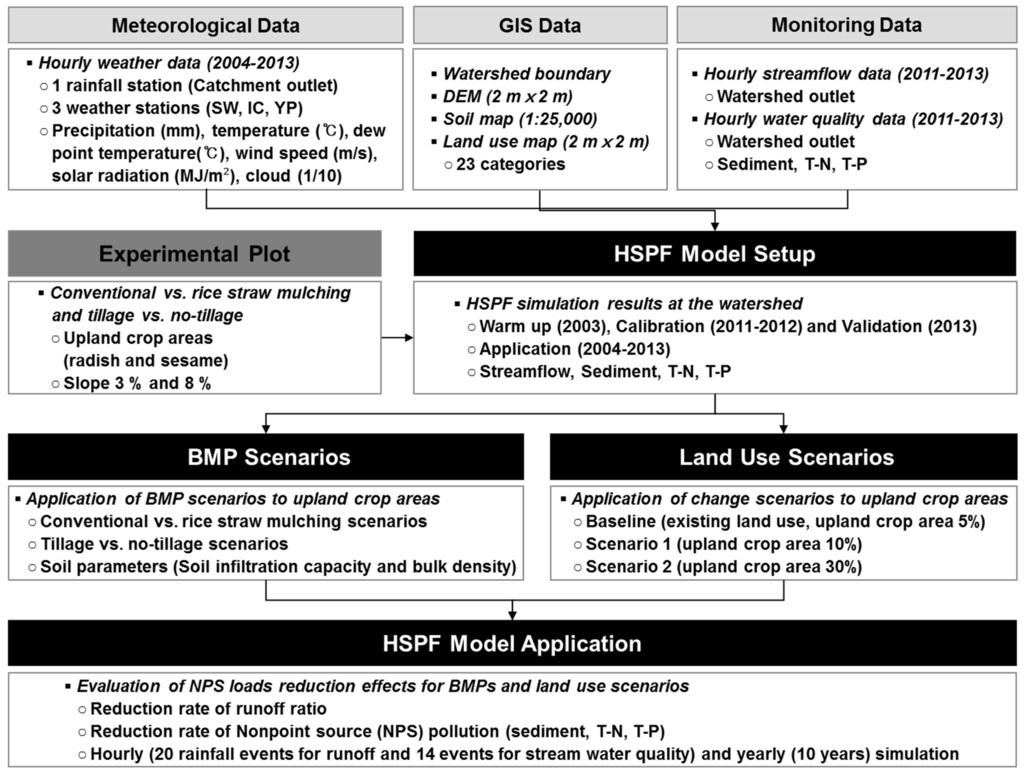 However, most of these previous studies focused on BMP scenario-based approaches using a watershed model; few studies have performed evaluations with watershed modeling using data obtained from an analysis of the discharge characteristics of pollutants from field-scale surveys and tests through actual application of BMPs. For example, Jung et al. [9], Jang et al. [10] and Ahn et al. [2] evaluated the effectiveness of BMP for rice straw mulching and no-tillage in reducing runoff, sediment, total nitrogen and total phosphorus using the SWAT and HSPF models.