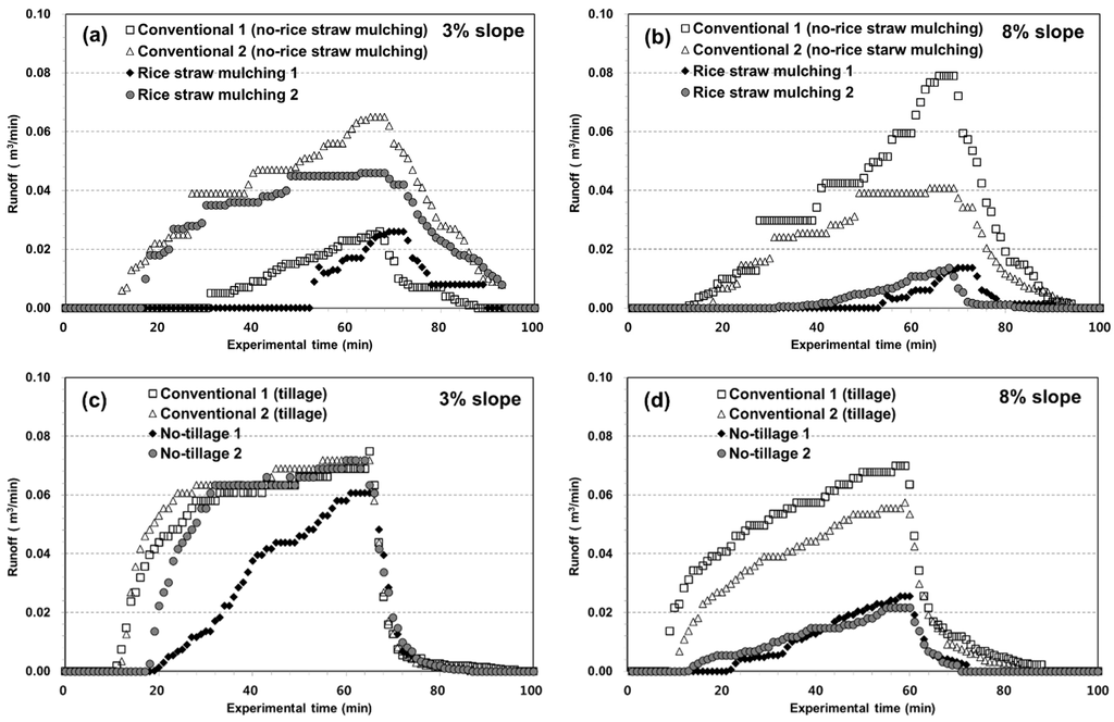 Field experiment results for runoff under the (a) rice straw mulching at 3% slope plot; (b) rice straw mulching at 8% slope plot; (c) no-tillage conditions at 3% slope plot; and (d) no-tillage conditions at 8% slope plot.