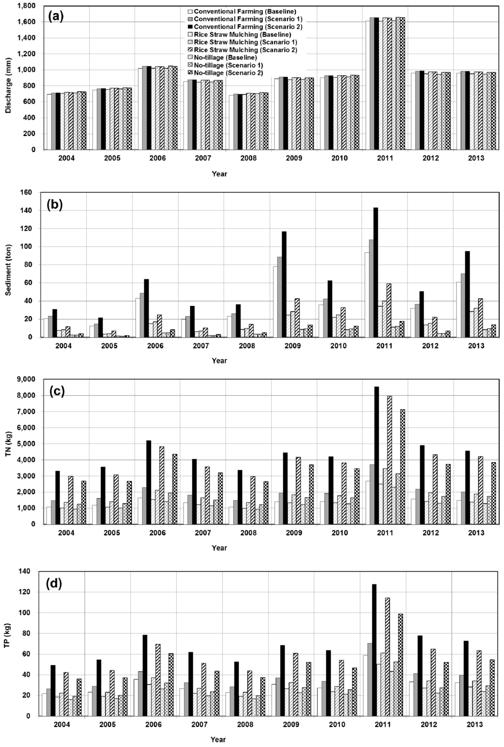 Figure 7 shows the hourly simulated peak runoff and runoff volume for rainfall events in relation to rainfall for three years (2011–2013) for the above land use scenarios. The straight line method was used for baseflow separation of the hydrograph. The results show that substantial reductions in peak runoff and runoff volume in all scenarios were found for large rainfall events. The average peak runoff and runoff volume for all scenarios father decreased by 9.2% and 6.0% under the rice straw mulching condition and by 7.3% and 11.5% under the no-tillage condition when the rainfall amount was over 200 mm when compared with rainfall events over 100 mm. Although peak runoff and runoff volume increased with increasing upland crop area, peak runoff and runoff volume can be reduced compared to conventional farming by applying rice straw mulching and no-tillage BMPs. Figure 8 presents the annual change in discharge, sediment, T-N and T-P for 10 years (2004–2013) for the above land use scenarios. The discharge, sediment, T-N and T-P were more strongly affected by upland crop area within the watershed compared with BMPs. In particular, the no-tillage practice was certainly helpful for reducing NPS pollution loads (sediment, T-N and T-P) compared to using rice straw mulching. The proportion of NPS pollution loads was increased at the same ratio of increasing upland crop area (a tripling of the upland crop area corresponded to a six-fold increase in NPS pollution loads). In particular, Table 6 and Figure 8b show the obvious change in sediment loads by land use scenarios at the watershed outlet main channel. Based on the result of the study, rainfall−runoff can be effectively controlled by farming methods in upland areas such as rice straw mulching and no-tillage practices. In addition, as a result, sediment loads flowing into the stream are decreased.