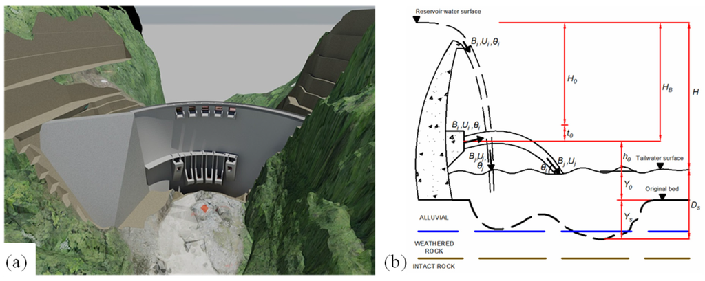 Paute-Cardenillo Dam (a) Three-dimensional view; (b) Scheme of scour.