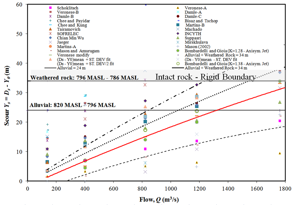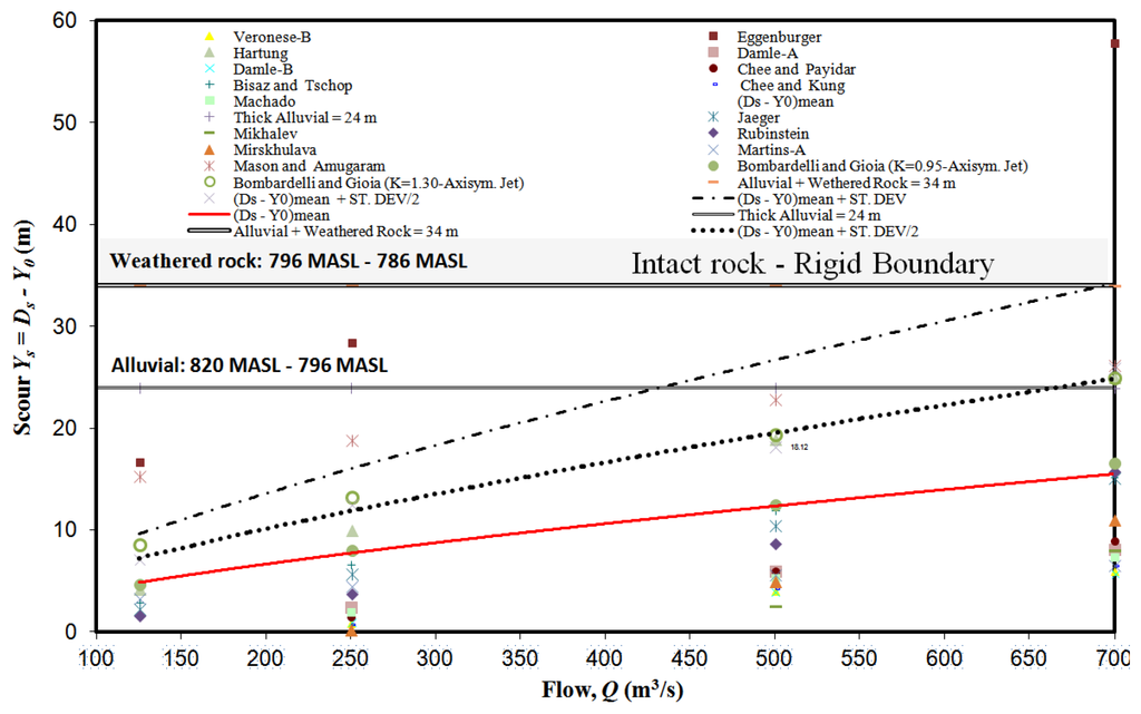Figure 2 shows the results obtained for the free surface weir. We indicated the range of the mean value ± 1 standard deviation. The maximum scour that is possible to simulate is until the weathered rock depth (total scour 34 m) because the intact rock represents a rigid boundary condition in the empirical formulae of scour. Considering the mean value for the design flow (700 m3/s), the scour could reach a depth of 17 m. However, taking into account the mean value + 0.50 standard deviation, then the design flow fully penetrates the alluvial (scour 24 m). Considering the mean value + 1 standard deviation, the design flow could reach the intact rock layer (scour 34 m).