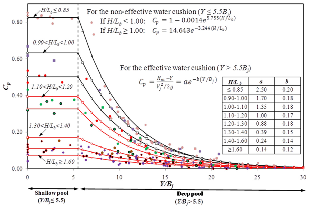 The dynamic pressure in the bottom of the stilling basin is based on two components: the mean dynamic pressure (Cp) and the fluctuating dynamic pressure (Cp'). We can use these dynamic pressure coefficients as estimators of the stream power reduction coefficients, by the effect of the jet disintegration in the air and their diffusion in the stilling basin (Annandale [31]). Hence, the dynamic pressures are also a function of the fall height to disintegration height ratio (H/Lb) and water cushion to impingement jet thickness (Y/Bj). Thus, the total dynamic pressure can be expressed as: