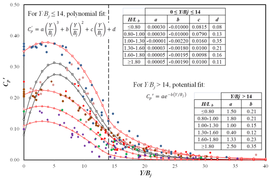 Fluctuating dynamic pressure coefficient (Cp') for the nappe flow case in function of ratios Y/Bj and H/Lb (Castillo et al. [27]).