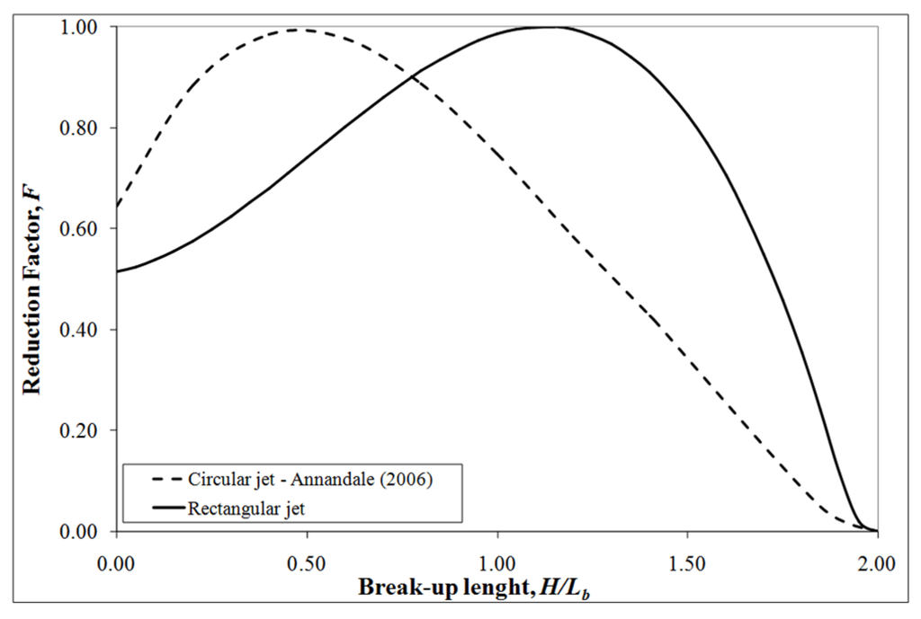 The dynamic pressures of jets are a function of the turbulence intensity at the discharge conditions, length of the jet flight, diameter (circular jet) or thickness (rectangular jet) in impingement jet conditions, and water cushion depth. Annandale [30,31] summarized and established a relationship between the stream power and the erodibility index for a wide variety of materials and flow conditions. Stream power per unit of area available of an impingement jet is: