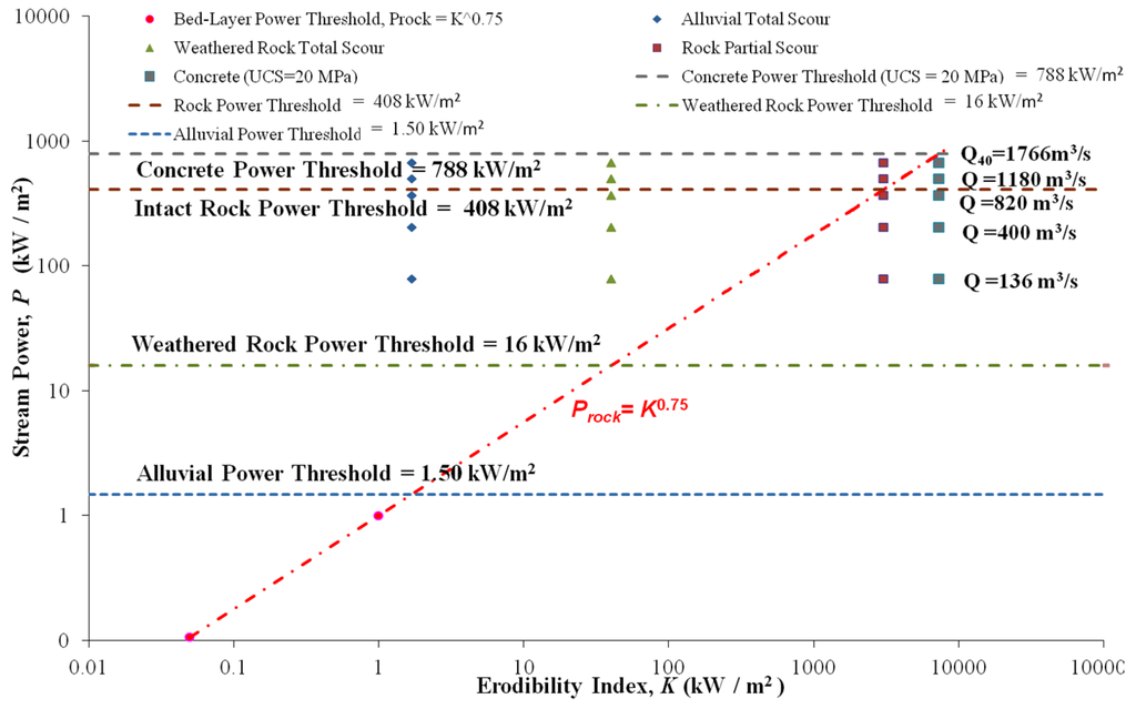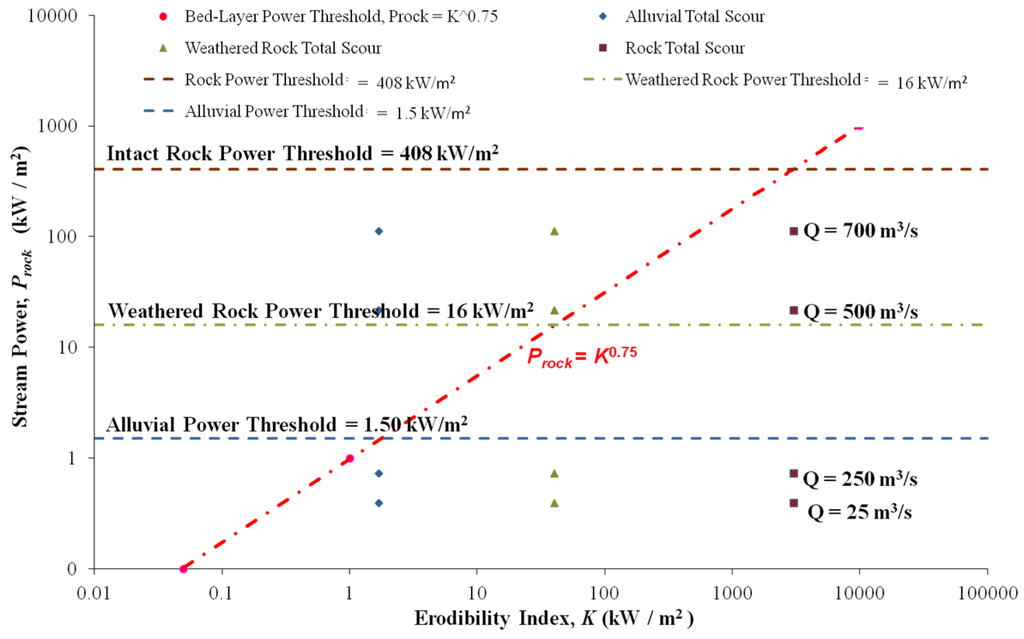 The threshold of rock strength to the stream power, expressed in kW/m2, is calculated and based on the erodibility index K.