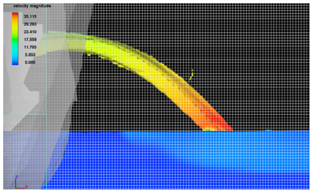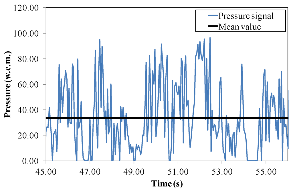 During the mesh size sensitivity analysis [25,26], we obtained the most accurate results by using a mesh size of 0.20 m. In the solver options, we selected the stability and convergence method and the free surface solved with the split Lagrangian method. Table 7 compares the mean pressure and the mean dynamic pressure coefficient obtained by the non-effective water cushion case, while Figure 9 shows the pressure signal calculated on the stagnation point with FLOW-3D and the mean value of the register.