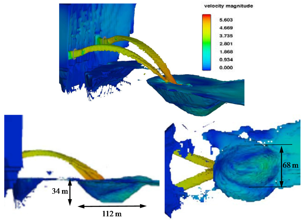 As far as the numerical simulation is concerned, the scour shape was analyzed considering the intact rock as non-erodible. The upstream face of the scour occurred approximately 85 m downstream from the dam. The plant scour was nearly 112 m long and 68 m wide.