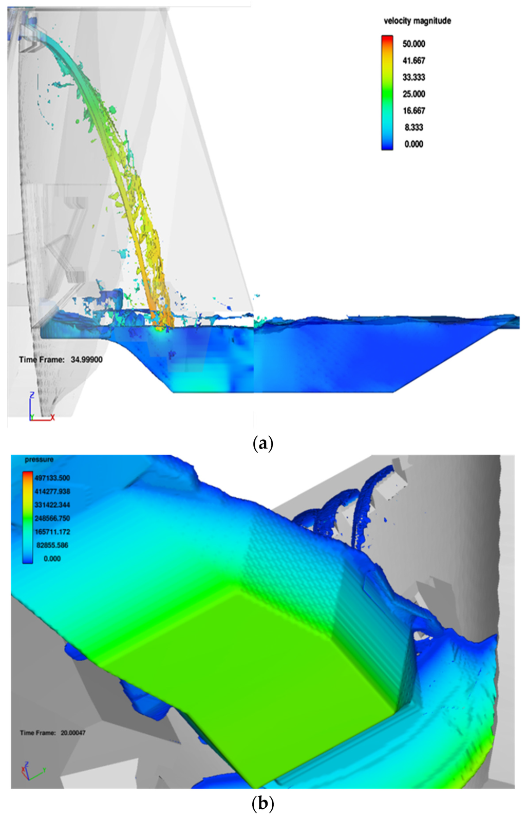 - Castillo, L.G.; Carrillo, J.M.; Blázquez, A. Plunge pool mean dynamic pressures: A temporal analysis in nappe flow case. J. Hydraul. Res. 2015, 53, 101–118. [Google Scholar] [CrossRef]
