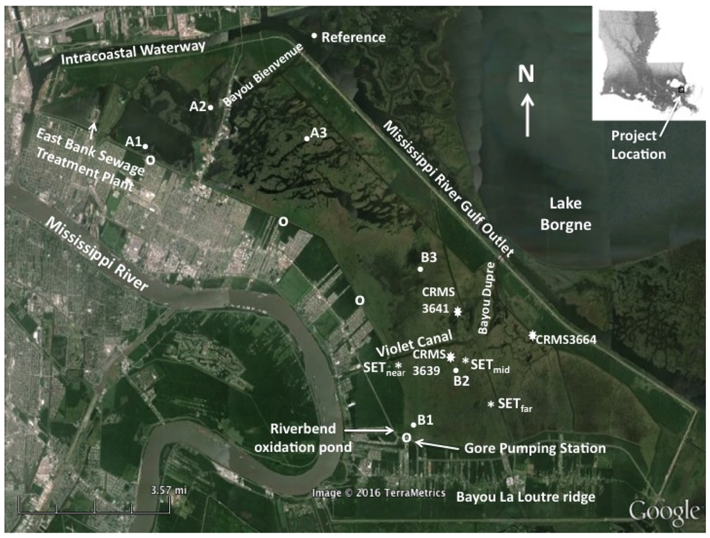To characterize the current ecological state of the CWU, we conducted an extensive study of the area. Seven study sites were selected to include near, mid, and far sites (relative to the interior flood protection levee) as well as a Reference site (Figure 1). Sites A1, A2, and A3 are located in the northern half of the CWU. A1 is open water and has no vegetation. Sites B1, B2 and B3 are in the southern half of the CWU, an area that drains via Violet Canal and Bayou Dupre (Figure 1). The “B” sites represent less disturbed wetlands compared to the “A” sites. The Reference site is a relatively undisturbed wetland area representative of natural conditions with little human influence.
