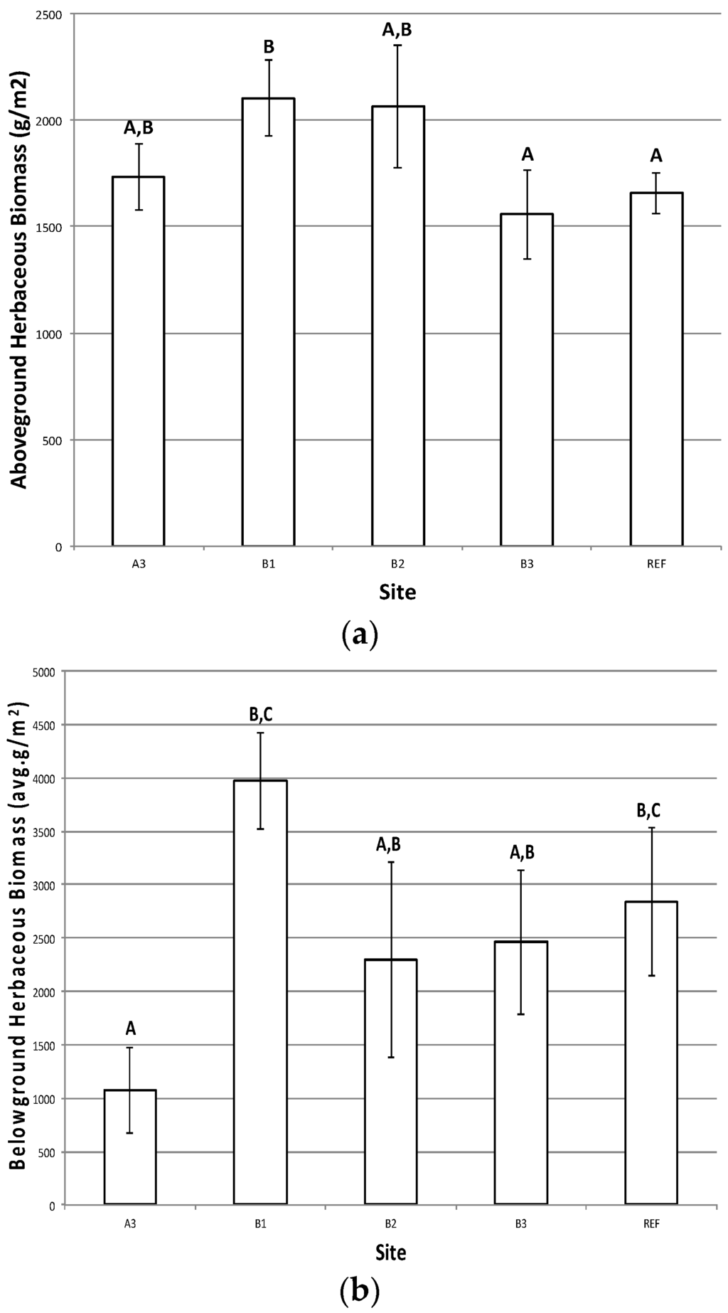 Aboveground (a); and belowground (b) herbaceous biomass at study sites in the CWU. Different letters indicate a significant difference α = 0.05. Error bars represent standard error of the mean.