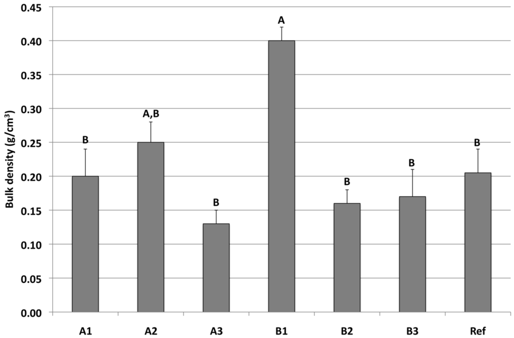Bulk density ranged from 0.13 to 0.42 g/cm3, with an overall mean of 0.22 ± 0.2 g/cm3. Bulk density was significantly higher at site B1, which is the site that has been receiving fresh water from the Gore Pumping Station and the Gore Oxidation Pond, than any of the other sites except A2 (p < 0.0060; Figure 4).